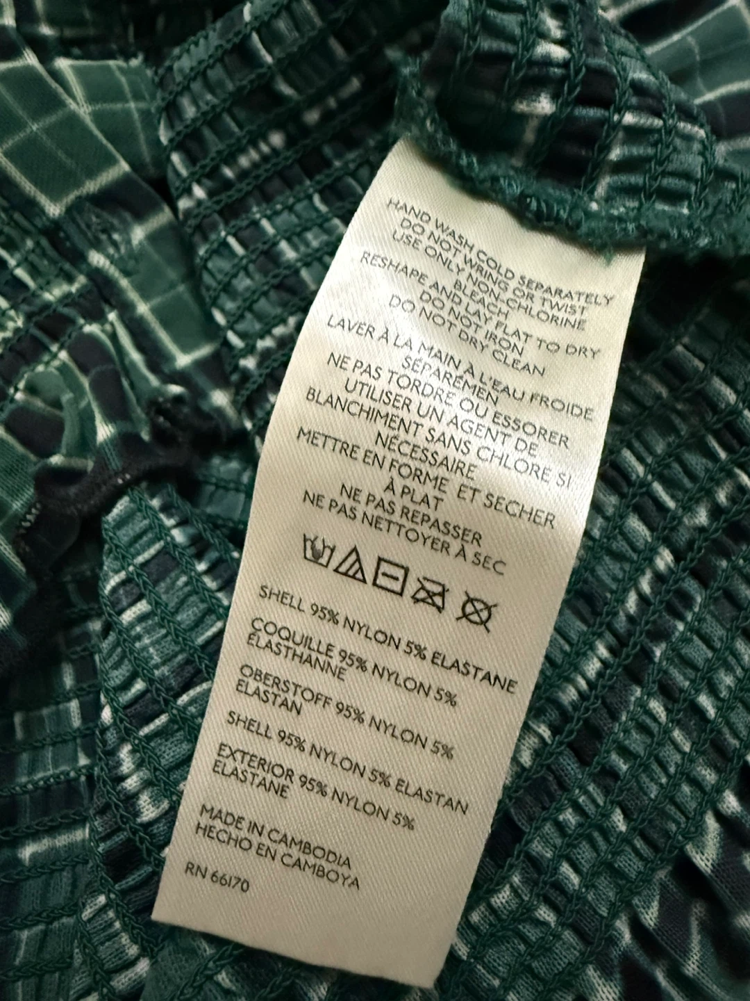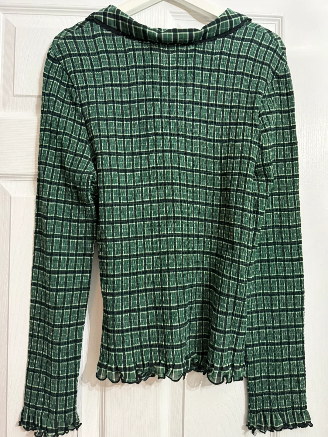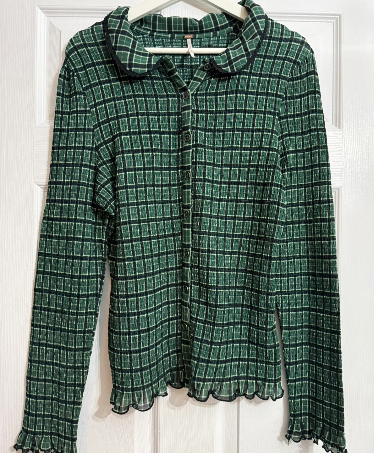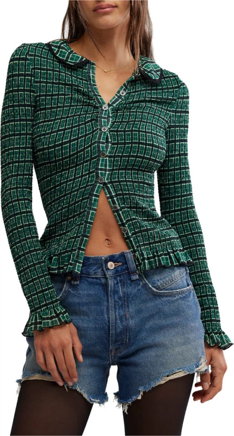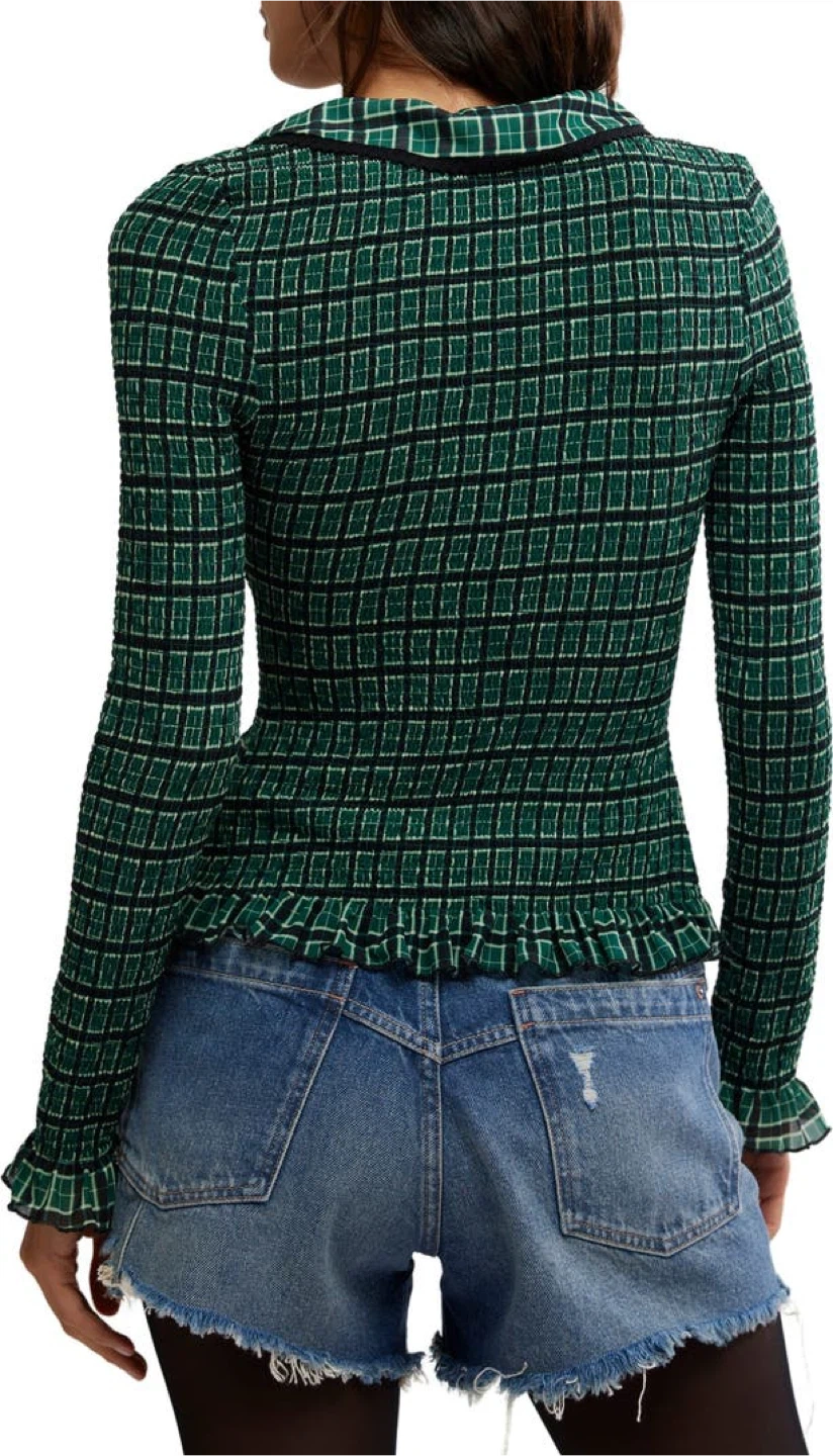 This Free People top features a green and black plaid pattern with smocked detailing. It's a button-up style with a collared neckline and ruffled cuffs. The fabric is stretchy and comfortable.