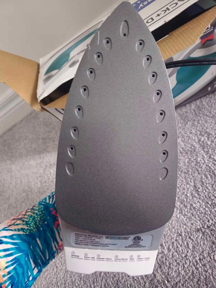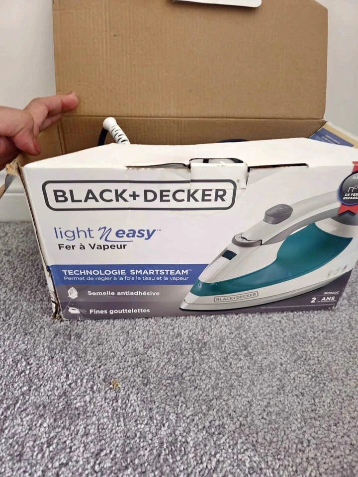 Pristine Black+Decker Light N Easy steam iron. This IR0820C model has SmartSteam technology for easy fabric and steam adjustment. Non-stick soleplate is great for smooth gliding. It has fine droplets for effective steaming. Runs on 120V, 1200W. Comes with original box.