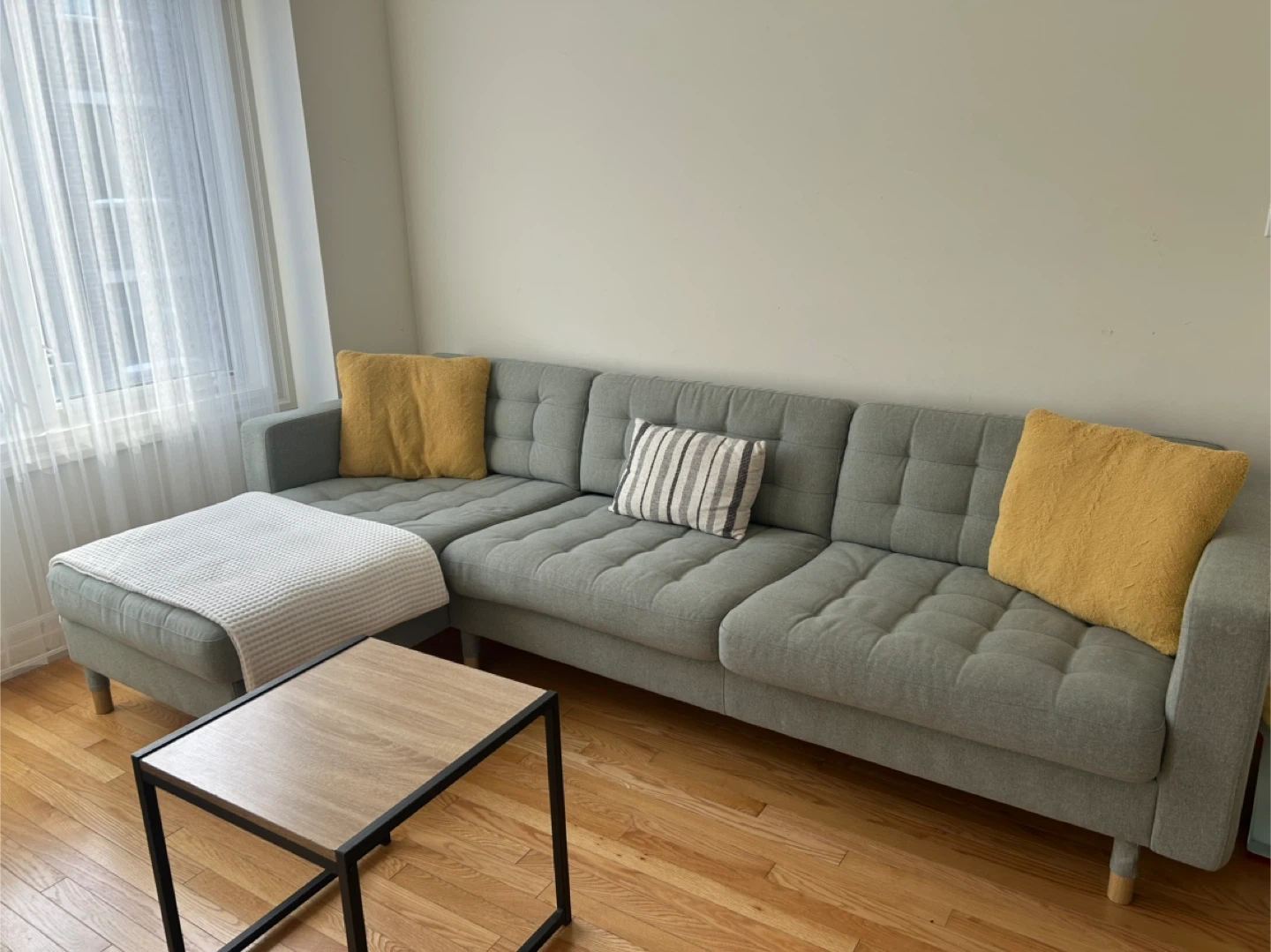 This IKEA MORABO sofa comes with a chaise, offering comfortable seating for your living space. It's upholstered in a light green fabric with wooden legs. Two decorative pillows in yellow and one striped pillow are included.