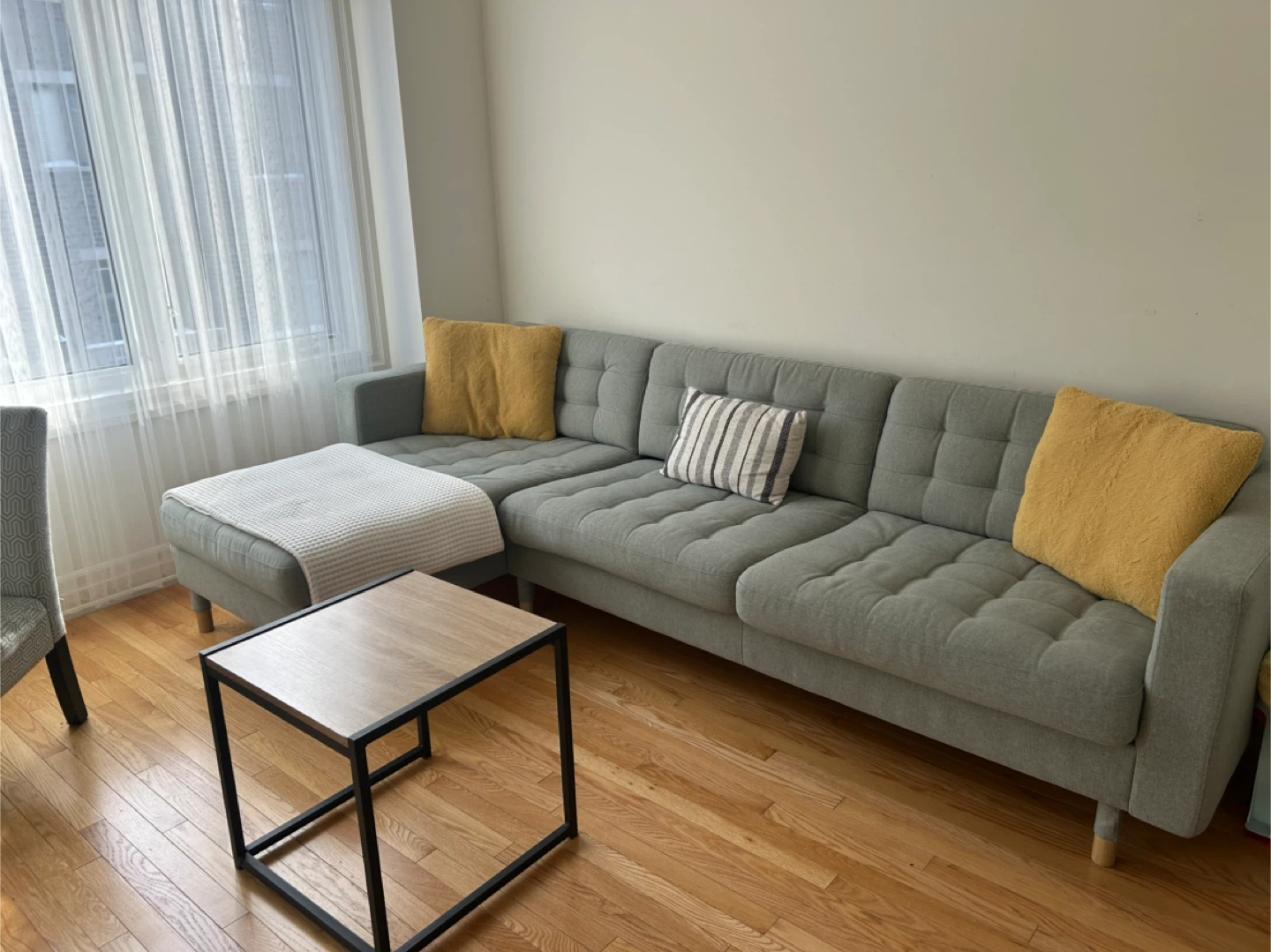 This IKEA MORABO sofa comes with a chaise, offering comfortable seating for your living space. It's upholstered in a light green fabric with wooden legs. Two decorative pillows in yellow and one striped pillow are included.