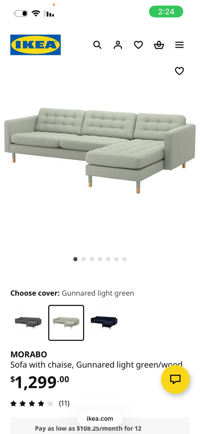IKEA MORABO Sofa with chaise - Light Green