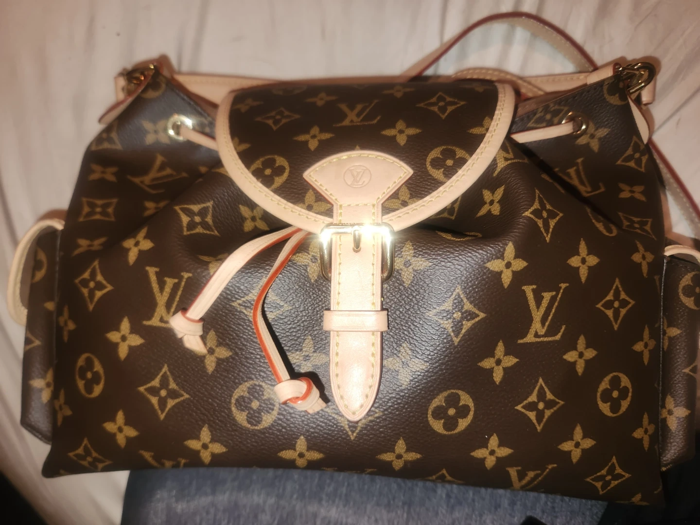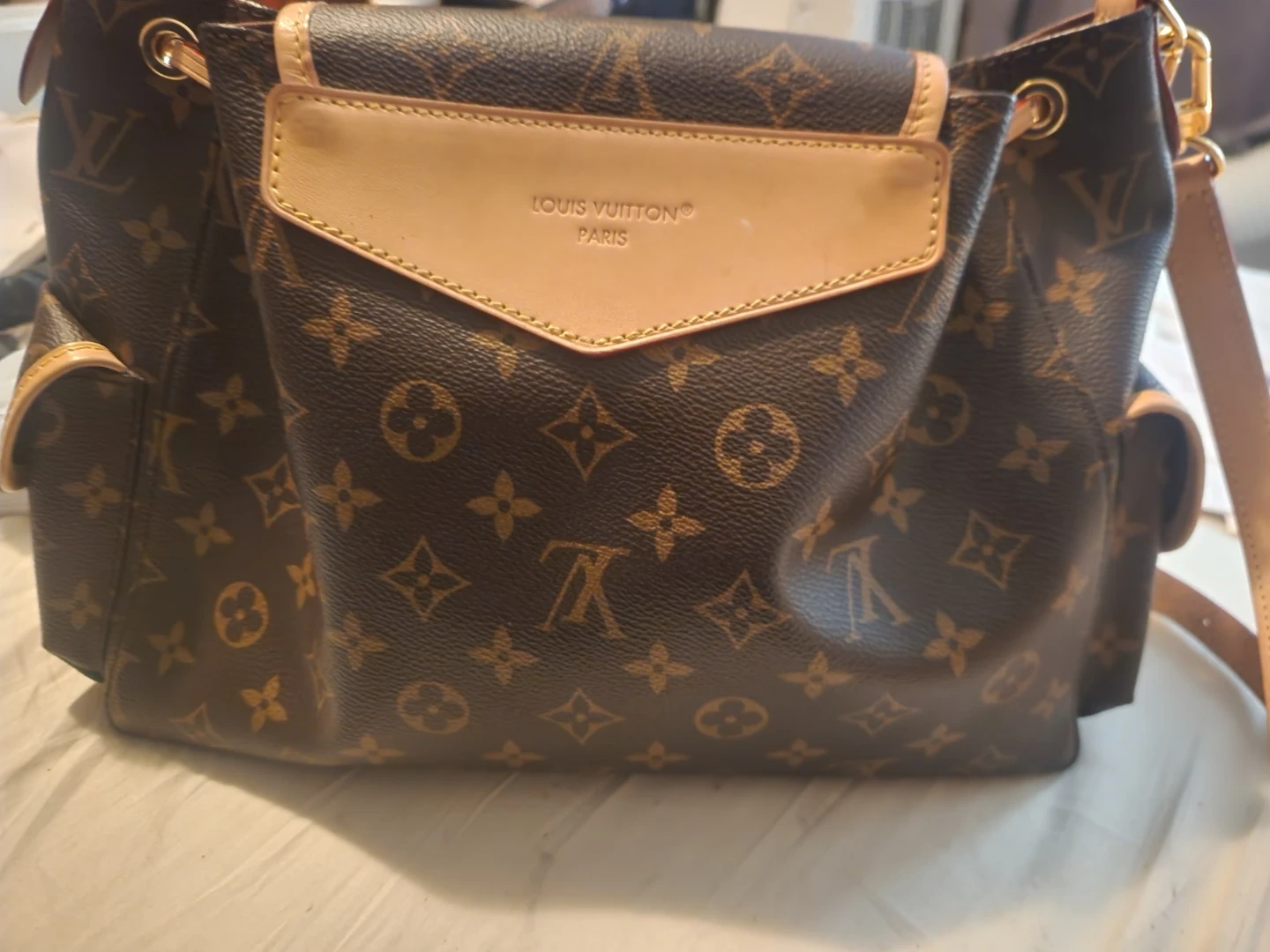 This Louis Vuitton shoulder bag is crafted from their iconic monogram canvas with Vachetta leather trim. It features a drawstring closure and a flap with a buckle detail. The bag has a single adjustable strap and a fabric-lined interior. It's a stylish and practical accessory for everyday use. Gently used, excellent condition. Priced for quick sale and open to reasonable offers.