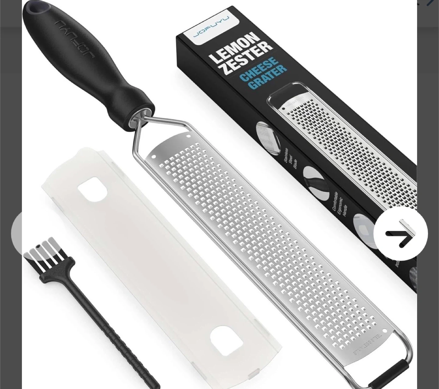 This JOFUYU zester cheese grater is made from stainless steel. It's 15 inches long with a comfortable black handle. Includes a protective cover and cleaning brush.