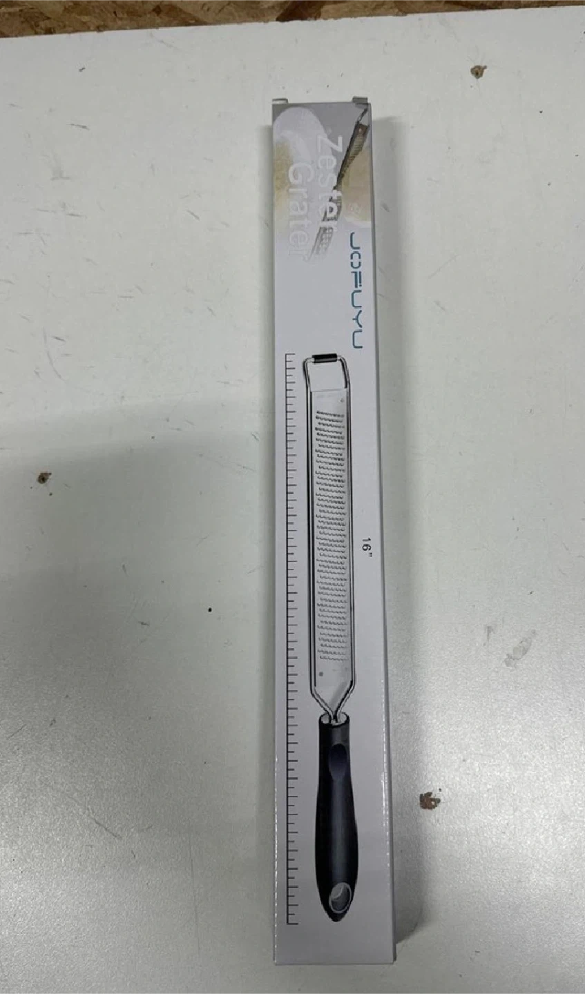 This JOFUYU zester cheese grater is made from stainless steel. It's 15 inches long with a comfortable black handle. Includes a protective cover and cleaning brush.
