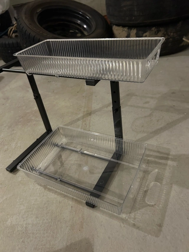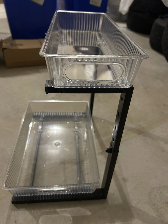 This new pantry or under-sink organizer is perfect for maximizing space and keeping your kitchen tidy. It features a two-tier design and durable construction with a black metallic frame. It comes unassembled with all hardware included. Let me know if you're interested!
