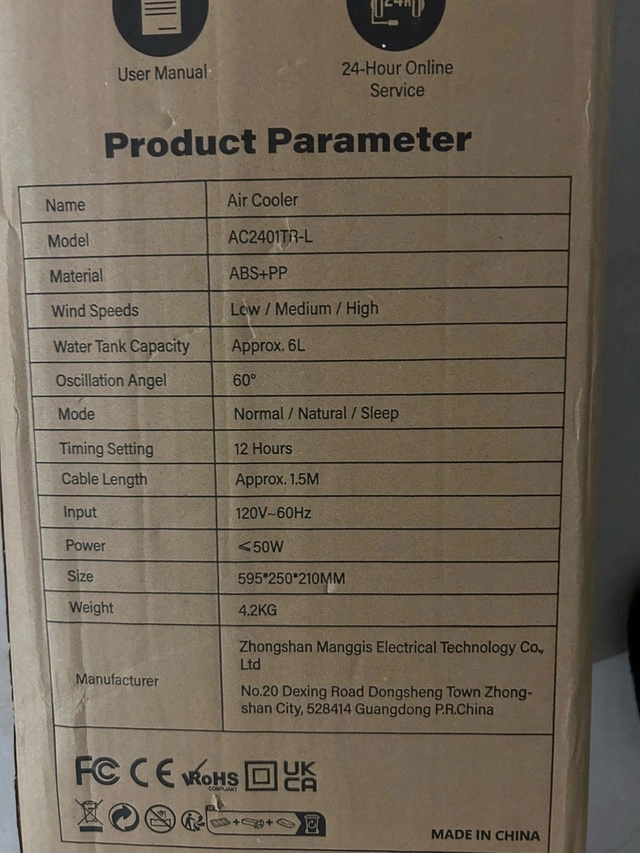 Keeps cool this summer with this new Zhongshan Manggis air cooler! This model AC240TR-L features a 6L water tank, three wind speeds (low, medium, high), and oscillation up to 60 degrees. It also has timing settings up to 12 hours and multiple modes (Normal, Natural, Sleep). Beat the heat with this efficient and easy-to-operate air cooler. Specifications: Model: AC240TR-L, Material: ABS/PP, Wind Speeds: Low/Medium/High, Water Tank Capacity: Approx. 6L, Oscillation Angle: 60 degrees, Modes: Normal/Natural/Sleep, Timing Setting: 12 Hours, Cable Length: Approx. 1.5m, Input: 120V-60Hz, Power: <50W, Size: 595*250*210MM, Weight: 4.2KG. If the ad is up, it's still available!