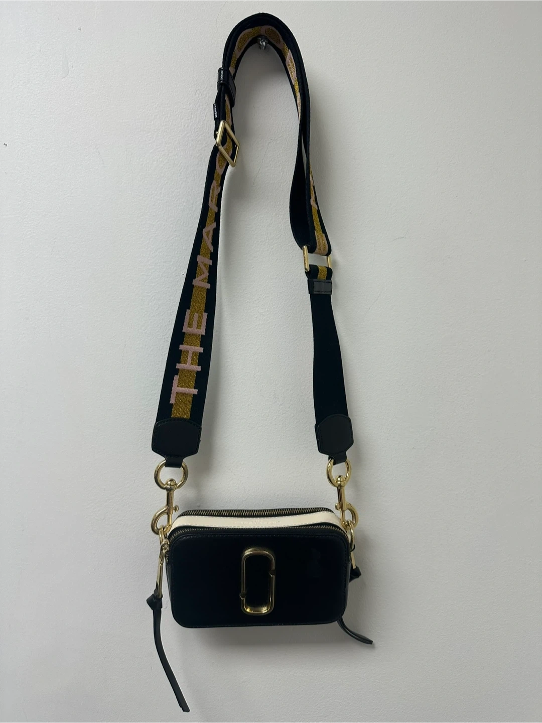 The Marc Jacobs Snapshot camera bag in black leather. It features a detachable logo strap and gold hardware. Perfect for carrying essentials on the go!