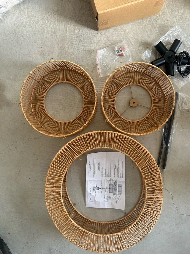 Brighten up your space with this stylish, new rattan ceiling light, featuring a unique woven design that adds a touch of natural elegance to any room. This eye-catching fixture is sure to be a conversation starter. Here are some details about the light: Style: Rattan, Type: Ceiling Light, Condition: New, Size: 20 inches diameter, Width of each circle: 6.5 inches. If the ad is up, it's still available. Grab it before it lights up someone else's life!