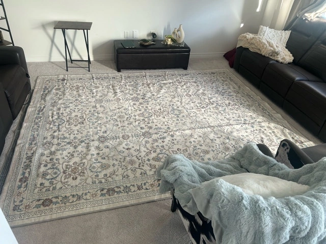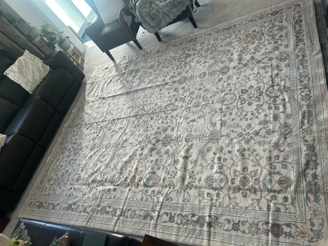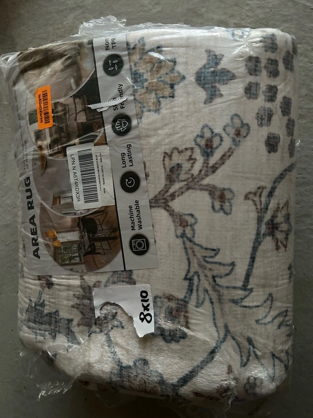 This brand-new 8x10 area rug is perfect for adding a touch of elegance to your living room or bedroom. It features a beautiful design and is machine washable for easy care. Size: 8x10 feet. Material: High-quality, durable fabric. Design: Elegant and versatile. Care: Machine washable. Condition: New, still in original packaging. If the ad is up, it's still available.