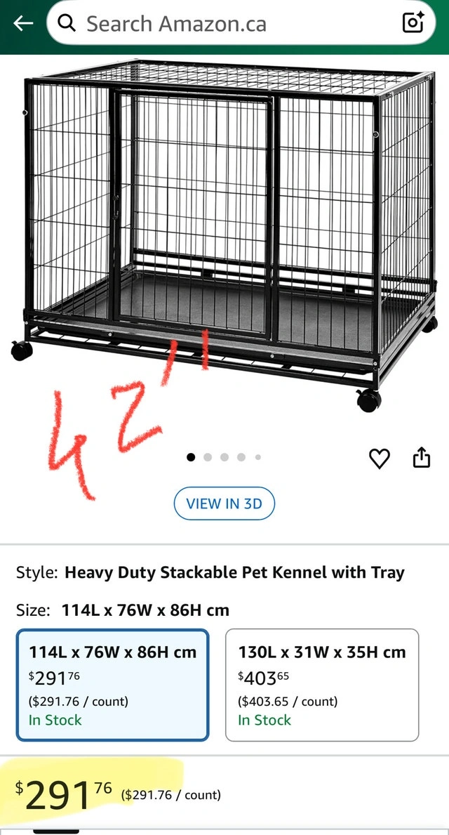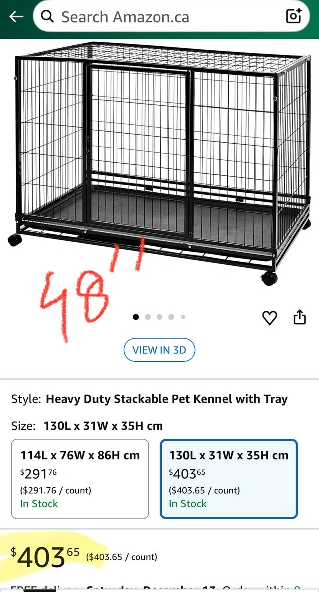 This is a new, never used Amazon Basics Heavy Duty Stackable Pet Kennel with Tray. It measures 48 inches, providing ample space for your furry friend. The heavy-duty construction ensures durability and security, while the stackable design allows for convenient storage. The included tray makes cleaning a breeze. Key Features: Heavy-duty construction, Stackable design, Includes tray for easy cleaning, 48 inches in length. Asking $120 for the 48" crate. If you see this ad, it means the crate is still available.