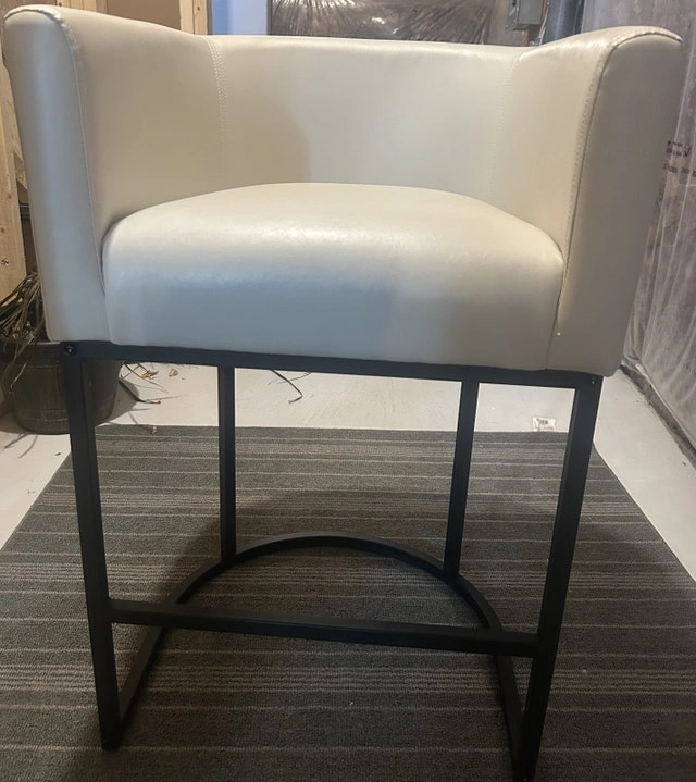 This new bar stool offers a sleek seating option with its cream-coloured faux leather seat and backrest, complemented by a sturdy black metal frame. Its modern design includes a convenient footrest, making it both stylish and comfortable for any counter or bar area. It is in new condition. If the ad is still up, it's still available!