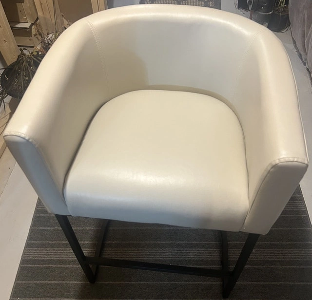 This new bar stool offers a sleek seating option with its cream-coloured faux leather seat and backrest, complemented by a sturdy black metal frame. Its modern design includes a convenient footrest, making it both stylish and comfortable for any counter or bar area. It is in new condition. If the ad is still up, it's still available!