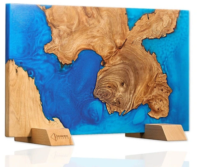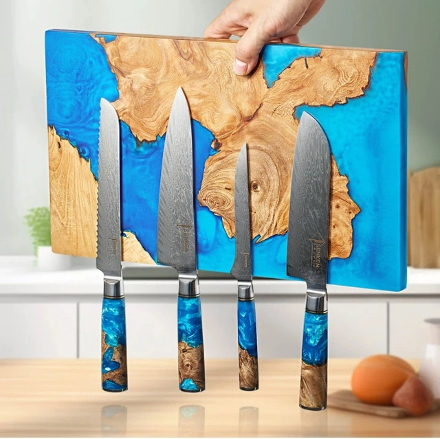 This is a new Senken Knife block. It features double sided magnets to allow storage on both sides of the block. It is made from natural Acacia wood and blue resin, crafted from Australian native Acacia Trees. It also has block stands to safely secure the block on any surface. Specifications: Ultra-Strong Neodymium Magnets, Dual-sided magnets, Natural Acacia Wood, Block Stands.