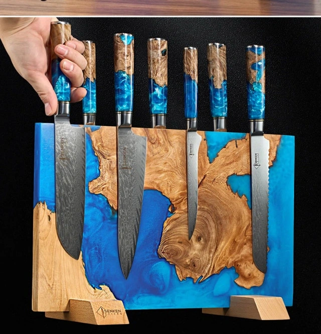 This is a new Senken Knife block. It features double sided magnets to allow storage on both sides of the block. It is made from natural Acacia wood and blue resin, crafted from Australian native Acacia Trees. It also has block stands to safely secure the block on any surface. Specifications: Ultra-Strong Neodymium Magnets, Dual-sided magnets, Natural Acacia Wood, Block Stands.