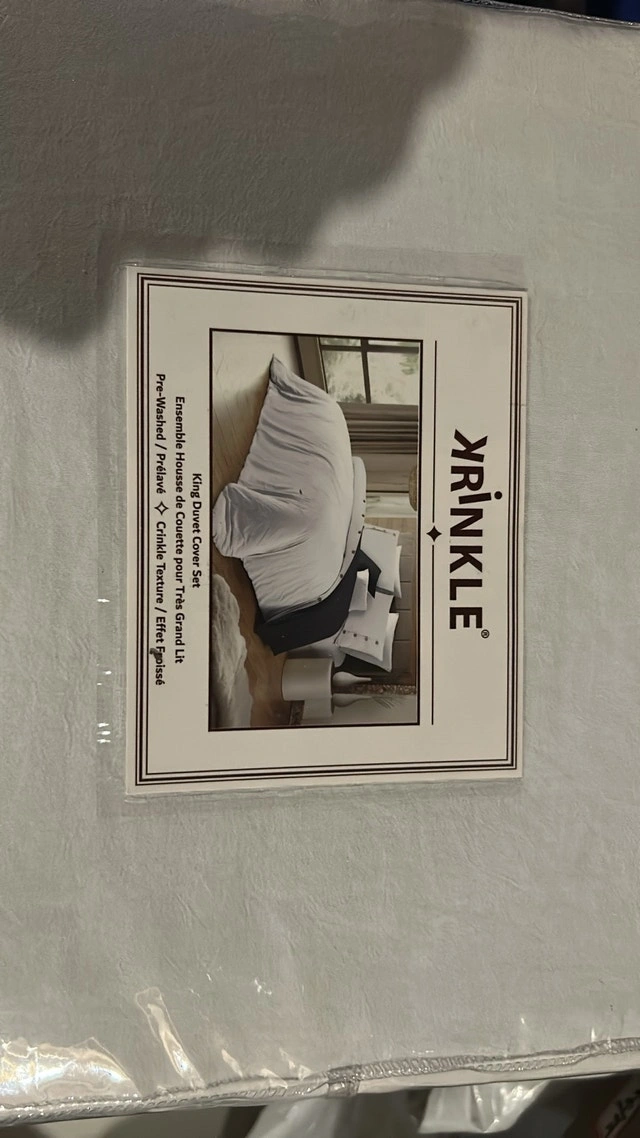 This is a new Yrinkle King Duvet Cover Set in white. The set includes a duvet cover and two shams, all made with a soft, crinkle-textured fabric. It's a great way to add a touch of elegance to your bedroom.