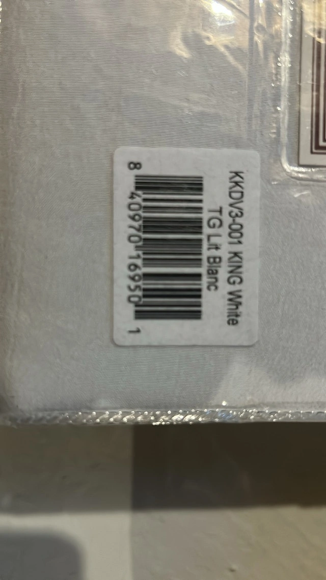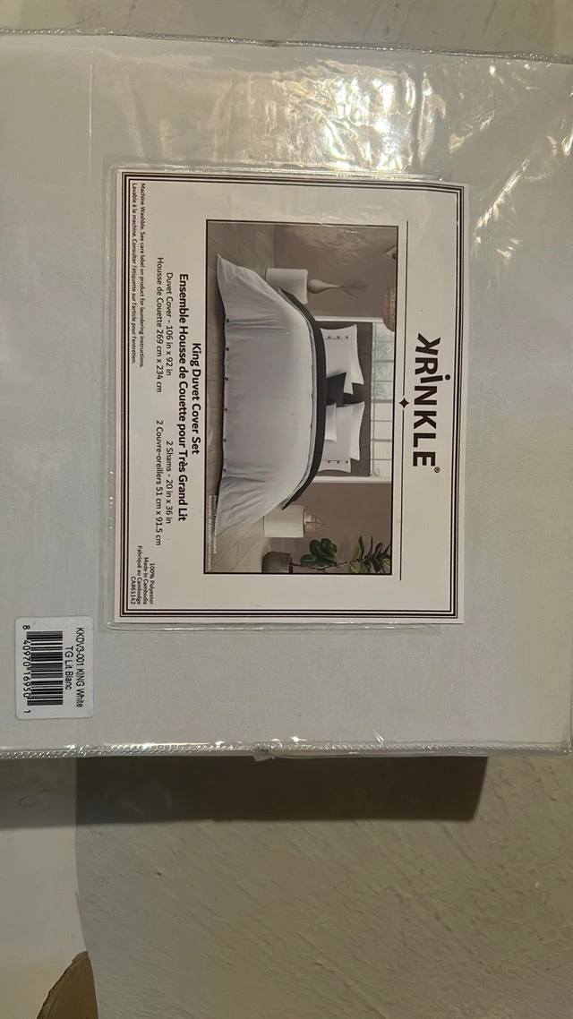 This is a new Yrinkle King Duvet Cover Set in white. The set includes a duvet cover and two shams, all made with a soft, crinkle-textured fabric. It's a great way to add a touch of elegance to your bedroom.