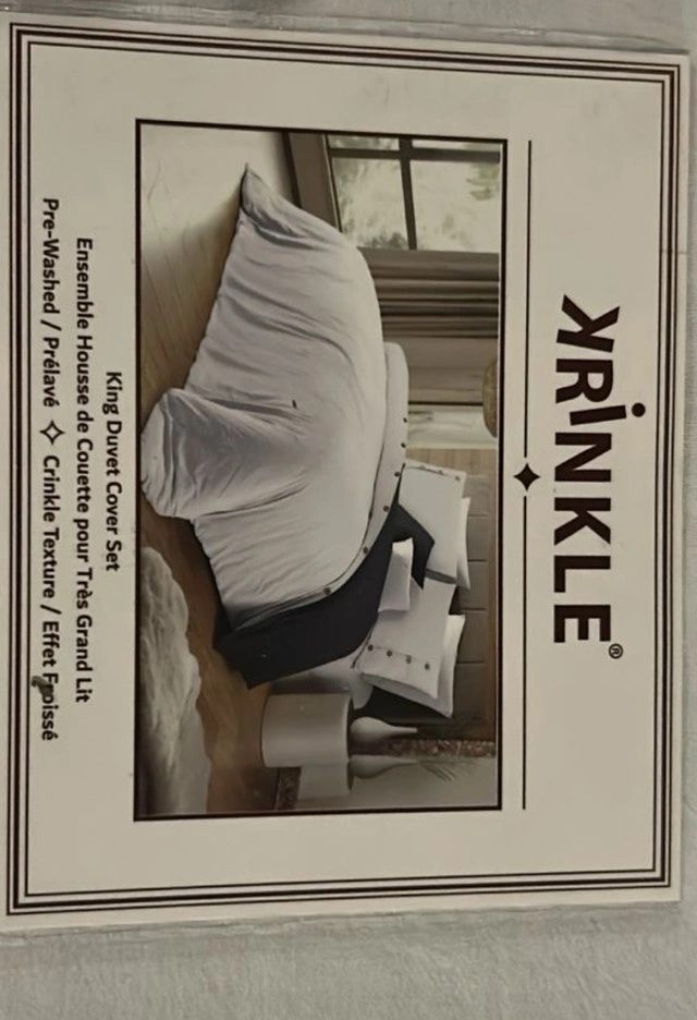 Refresh your bedroom with this new YRINLKE king duvet cover set, featuring a pre-washed crinkle texture for ultimate comfort and style. It promises a soft and inviting feel, perfect for any master or guest suite. Key Features: Size: King, Texture: Crinkle, Condition: New, Pre-washed. Add a touch of relaxed elegance to your home decor! If the ad is still up, it's still available.
