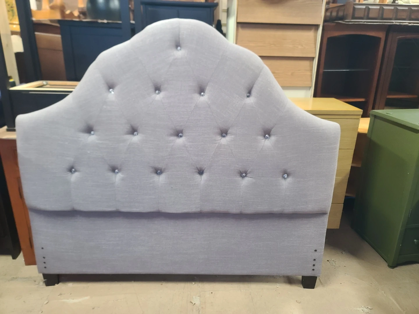 Elegant light grey/lavender upholstered headboard. Has a tufted design with pretty crystal-like buttons. Measurements to follow. Delivery can be arranged. Viewing and pickup by appointment.