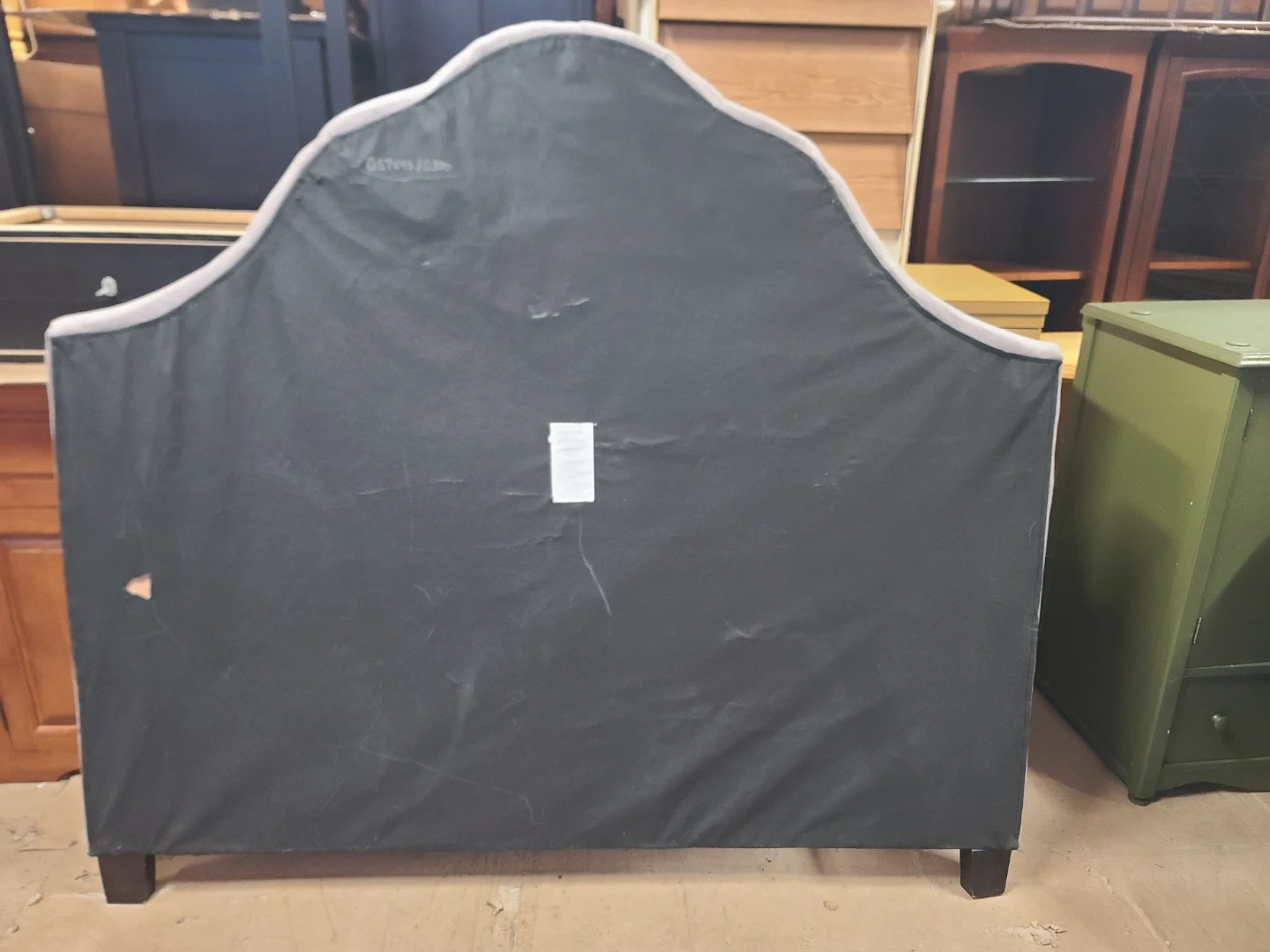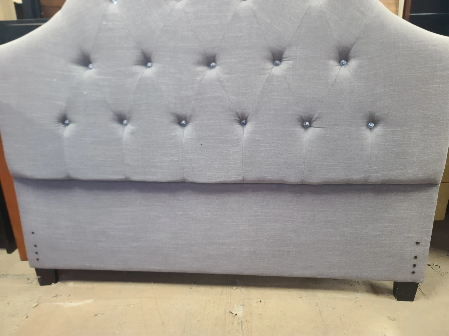 Elegant light grey/lavender upholstered headboard. Has a tufted design with pretty crystal-like buttons. Measurements to follow. Delivery can be arranged. Viewing and pickup by appointment.