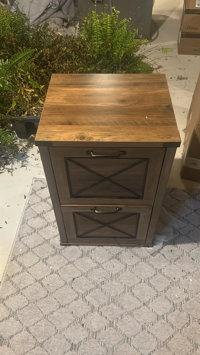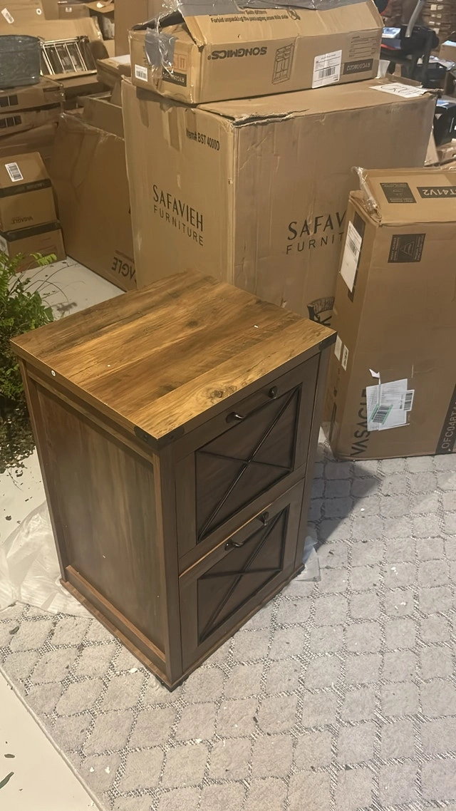 This is a new Safavieh filing cabinet, perfect for organizing your home office with style and functionality. The two-drawer design and rustic wood finish add a touch of elegance to any workspace. Features: - Brand: Safavieh - Two drawers for ample storage - Rustic wood finish - Stylish "X" design on drawer fronts. If the ad's up, it's up for grabs!