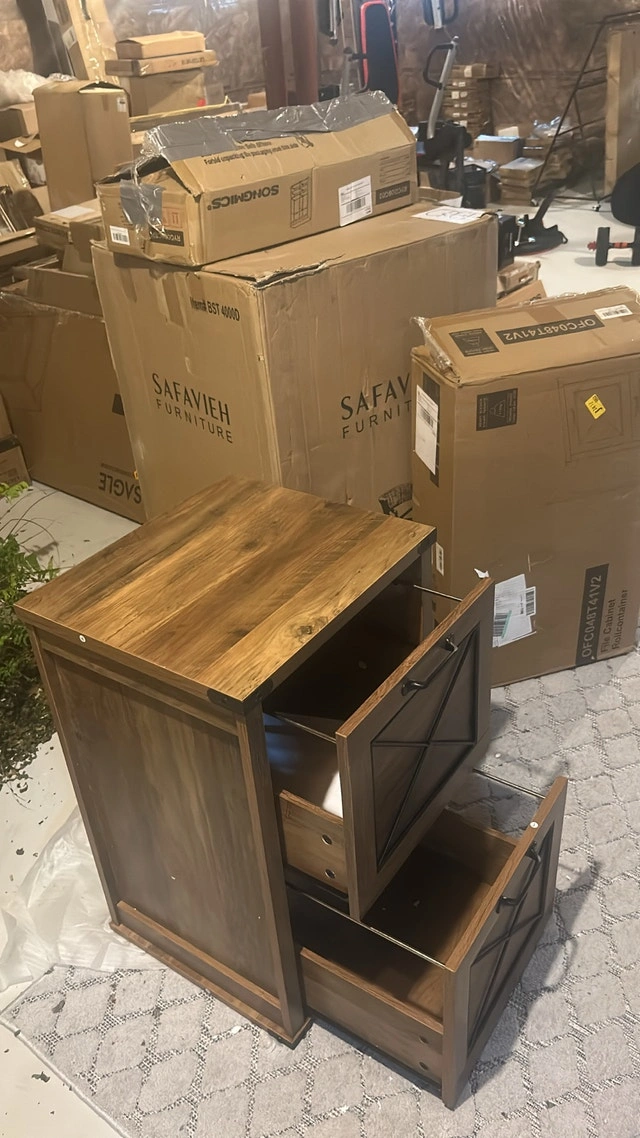 This is a new Safavieh filing cabinet, perfect for organizing your home office with style and functionality. The two-drawer design and rustic wood finish add a touch of elegance to any workspace. Features: - Brand: Safavieh - Two drawers for ample storage - Rustic wood finish - Stylish "X" design on drawer fronts. If the ad's up, it's up for grabs!