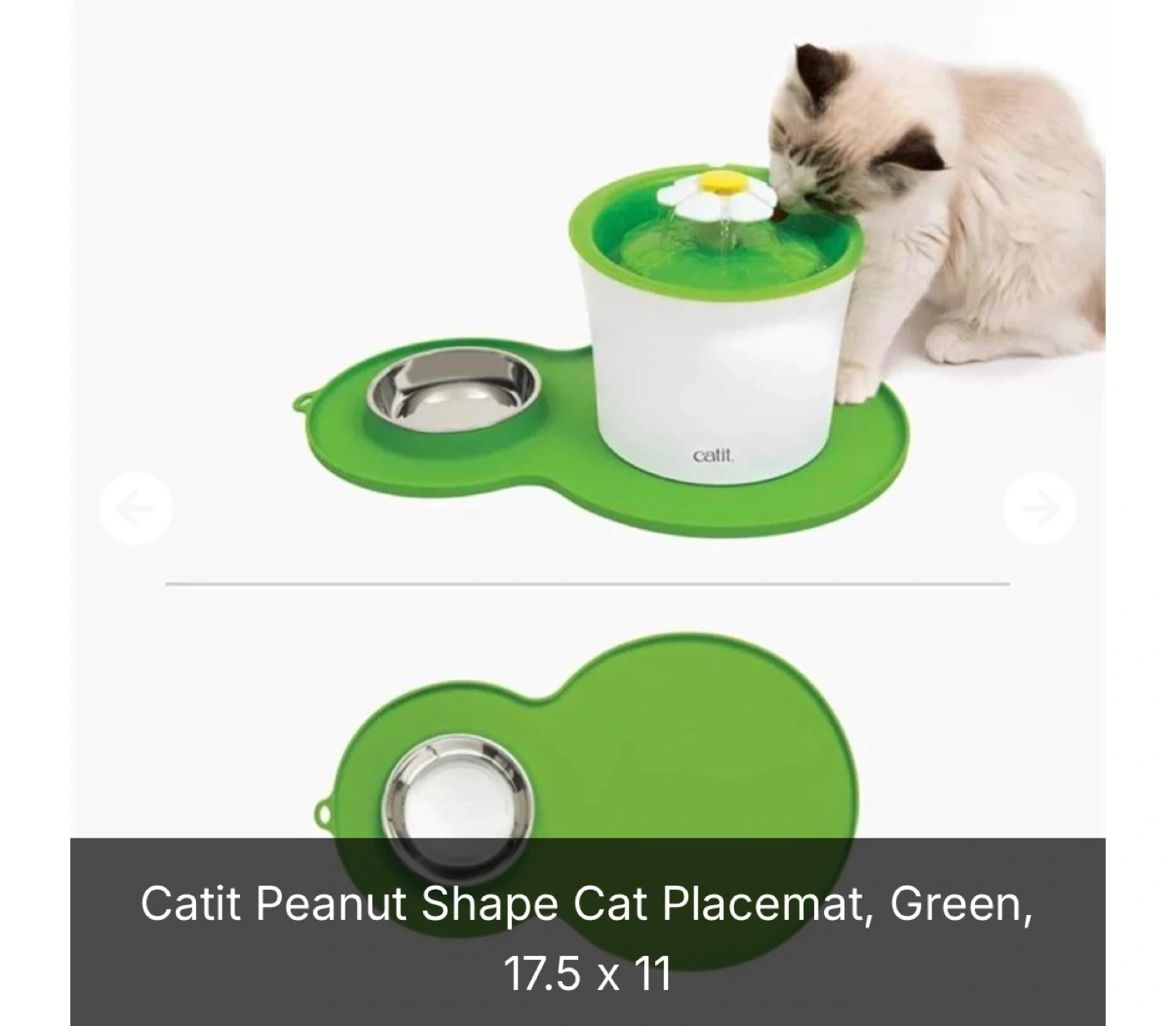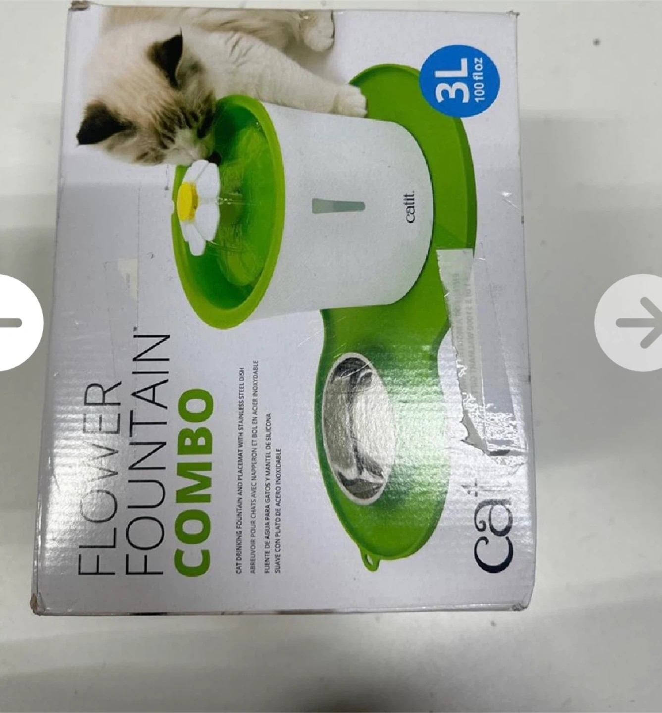 This Catit pet fountain is white and green with a flower-shaped top. It's designed to encourage pets to drink more water. The fountain has a water level indicator and comes with a USB power cord. It's made of durable plastic.