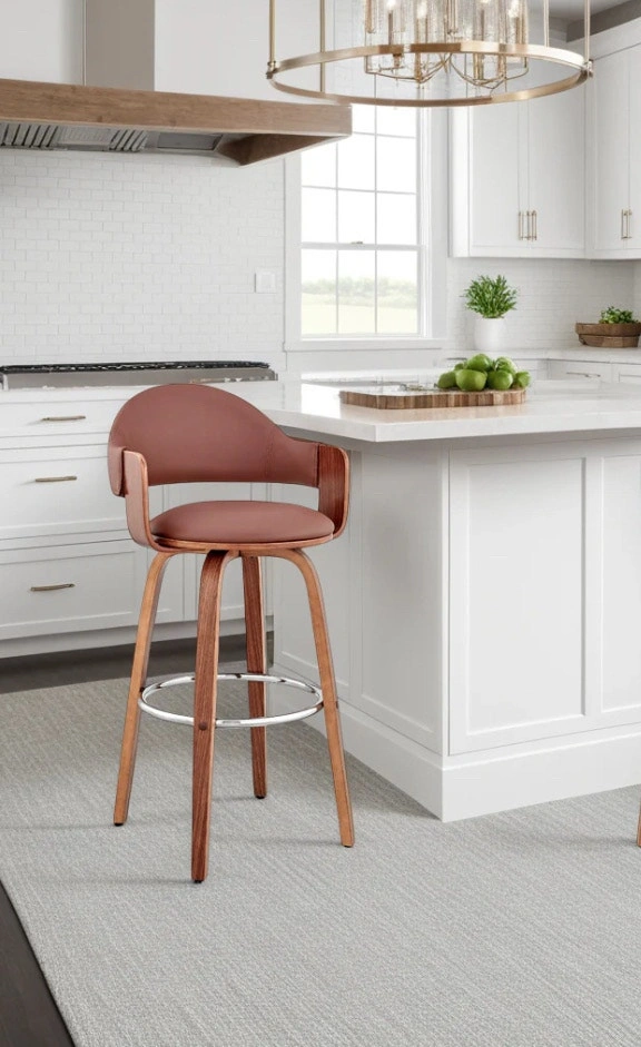 Enhance your kitchen or bar area with this brand new Daxton bar stool, featuring a 26-inch height, brown faux leather upholstery, and elegant walnut wood accents. This stool combines comfort and style, making it a perfect addition to any modern home. The sleek design and sturdy construction ensure lasting quality and a chic aesthetic. Specifications: Height: 26 inches, Upholstery: Brown Faux Leather, Frame: Walnut Wood. If you're seeing this ad, it's still available, ready to find its new home.