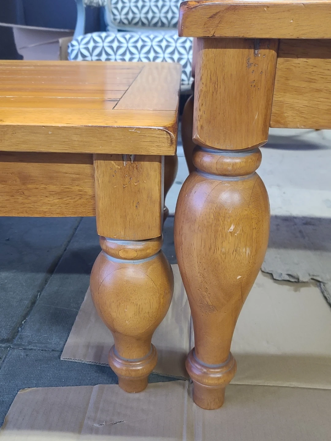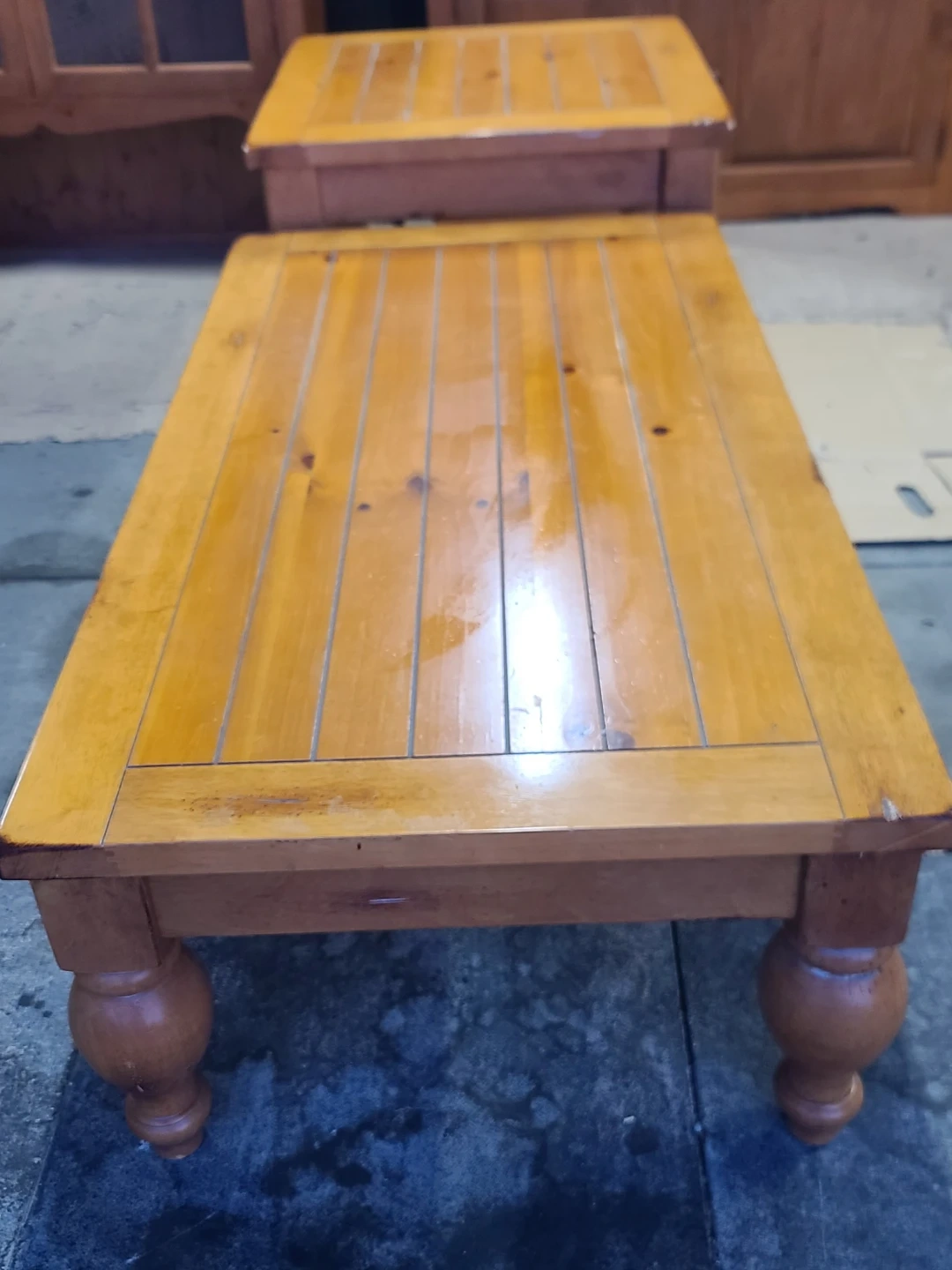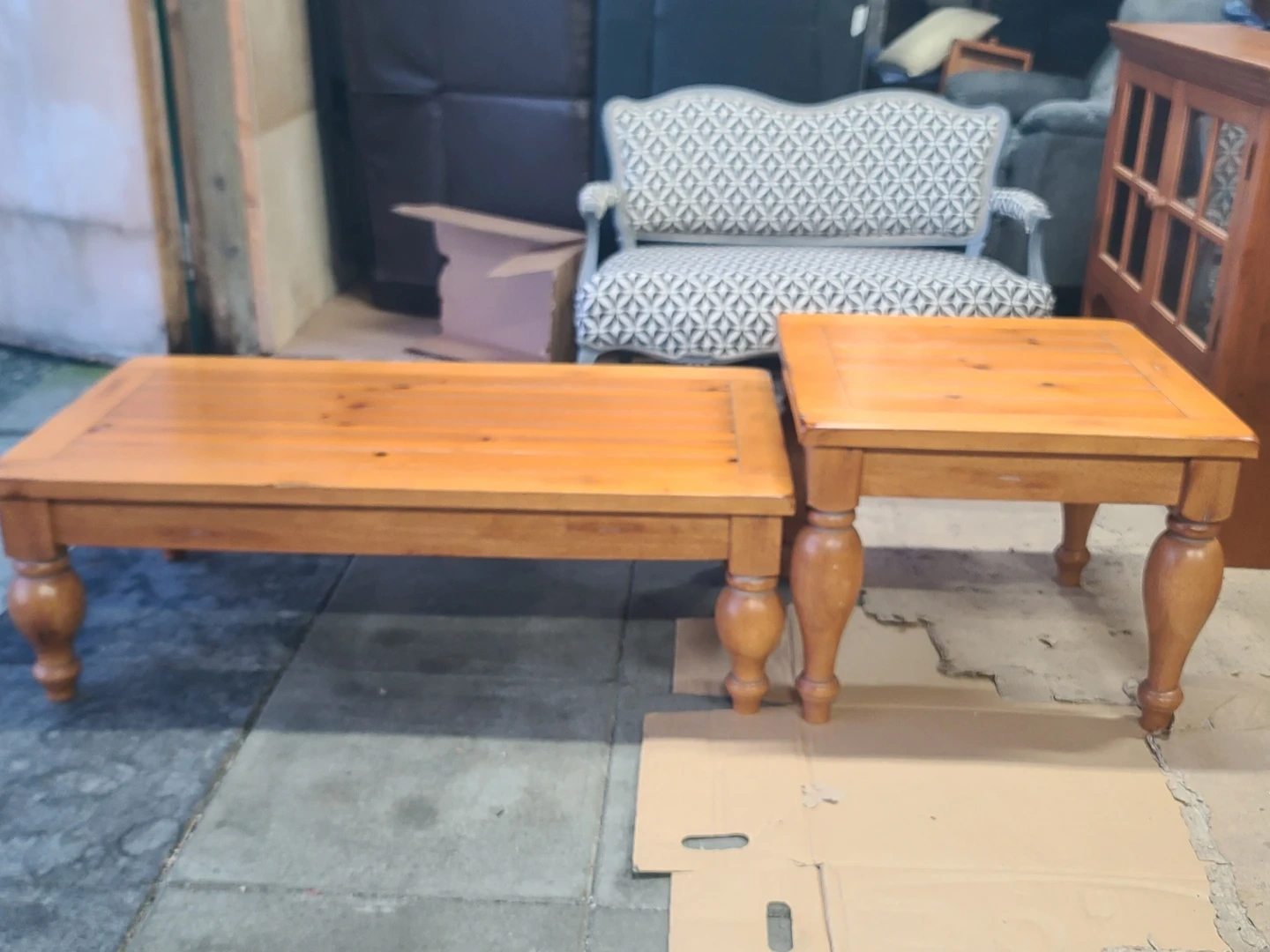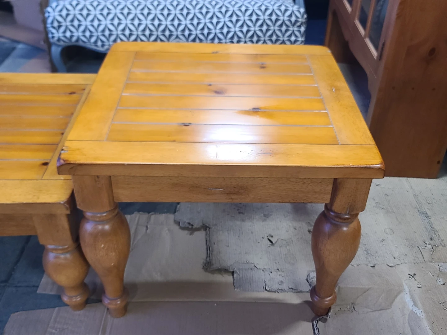 A set of two solid wood tables, a coffee table and an end table. Both tables have a warm, natural wood finish and turned legs. Some minor wear is visible on the edge of the coffee table. These tables are sturdy and ready for a new home. Measurements to follow. Delivery can be arranged. Viewing and pickup by appointment.