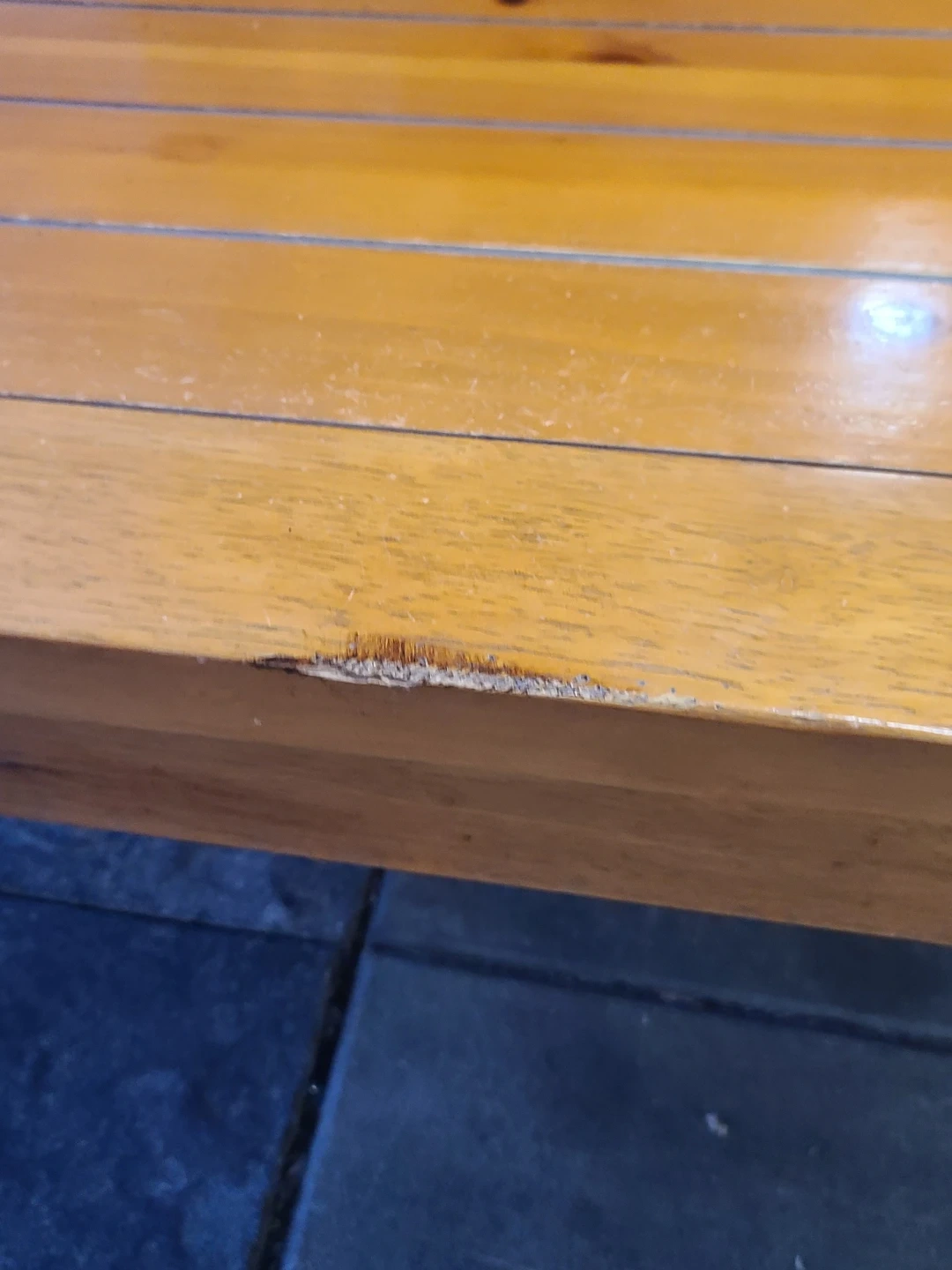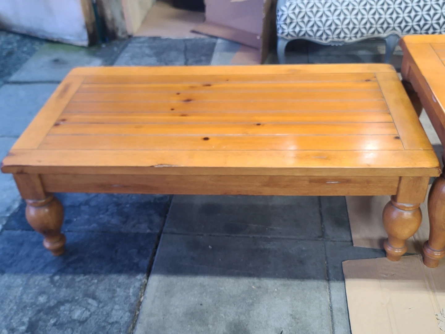 A set of two solid wood tables, a coffee table and an end table. Both tables have a warm, natural wood finish and turned legs. Some minor wear is visible on the edge of the coffee table. These tables are sturdy and ready for a new home. Measurements to follow. Delivery can be arranged. Viewing and pickup by appointment.