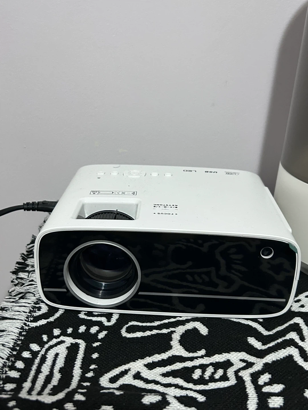This is a white LED projector. It has manual focus and keystone correction. It's great for home movie nights or presentations.