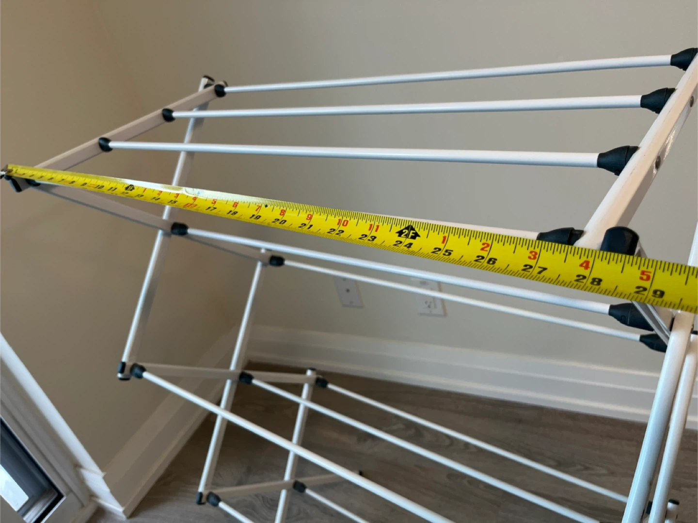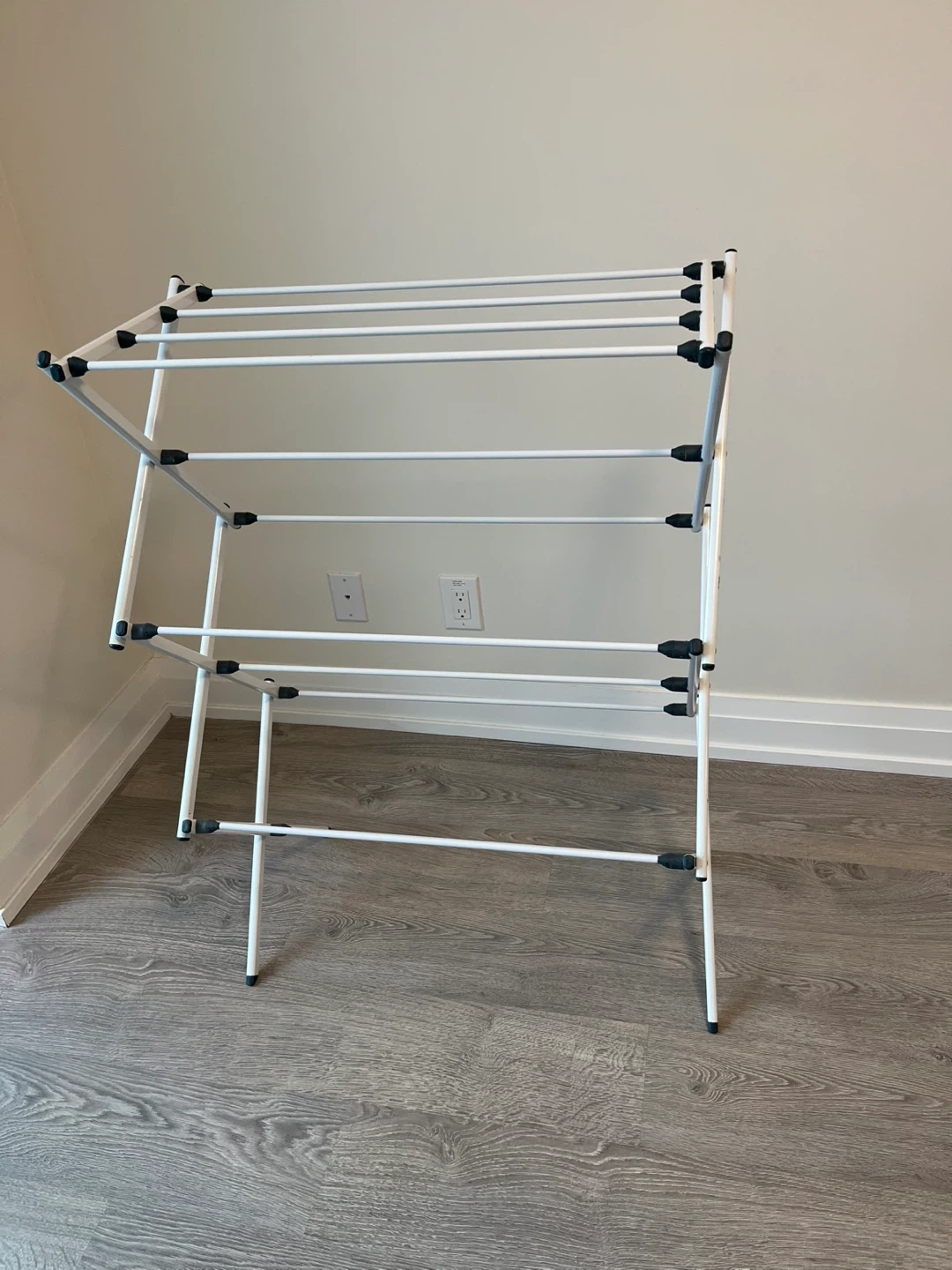 This white folding drying rack is made of metal. It's about 41 inches tall and 29 inches wide when open. It's a convenient way to dry clothes indoors.