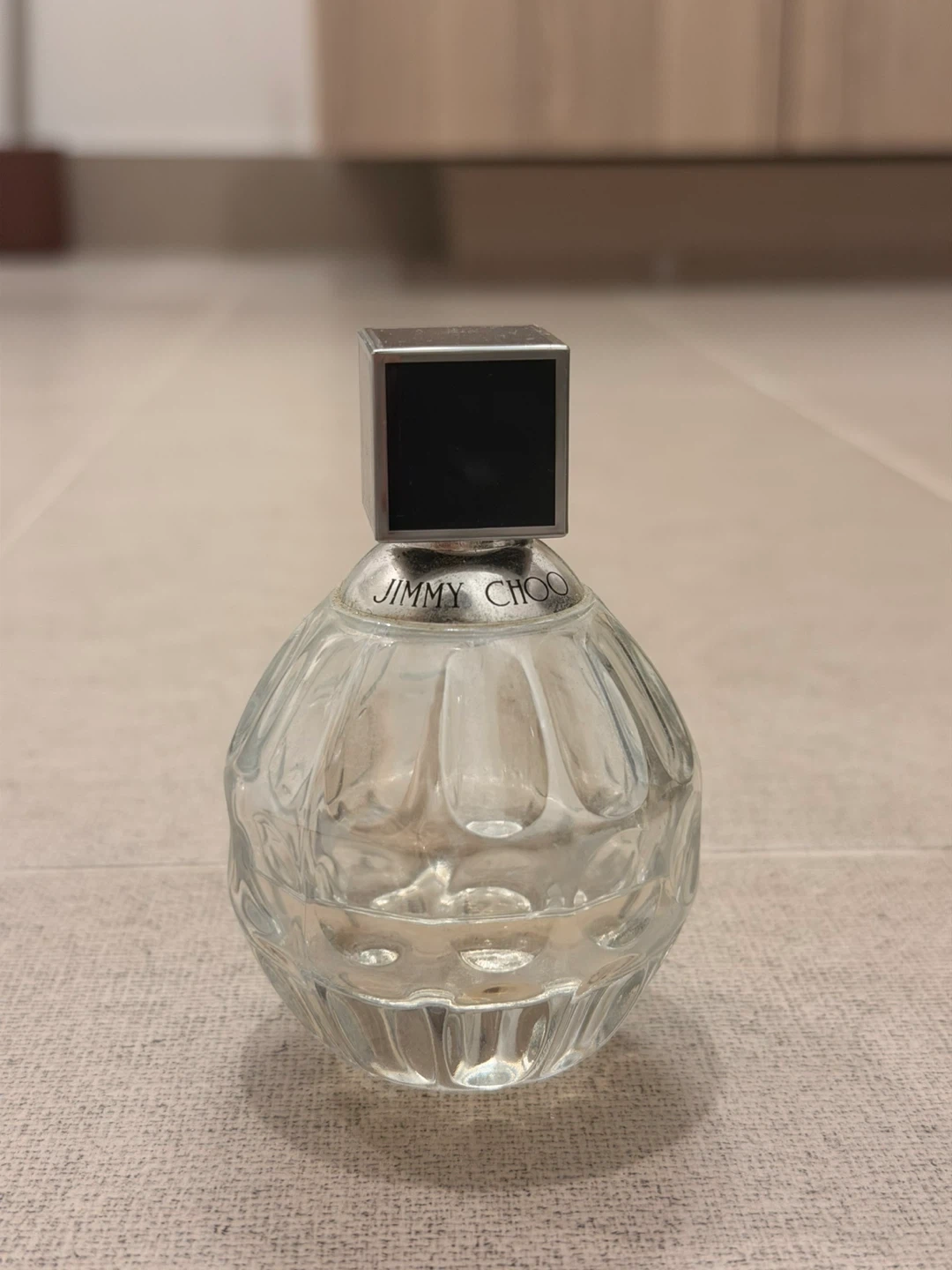 This is a miniature bottle of Jimmy Choo Eau de Parfum. It's a glass perfume bottle with a square cap. Perfect for travel or a collector! 1/3 left
