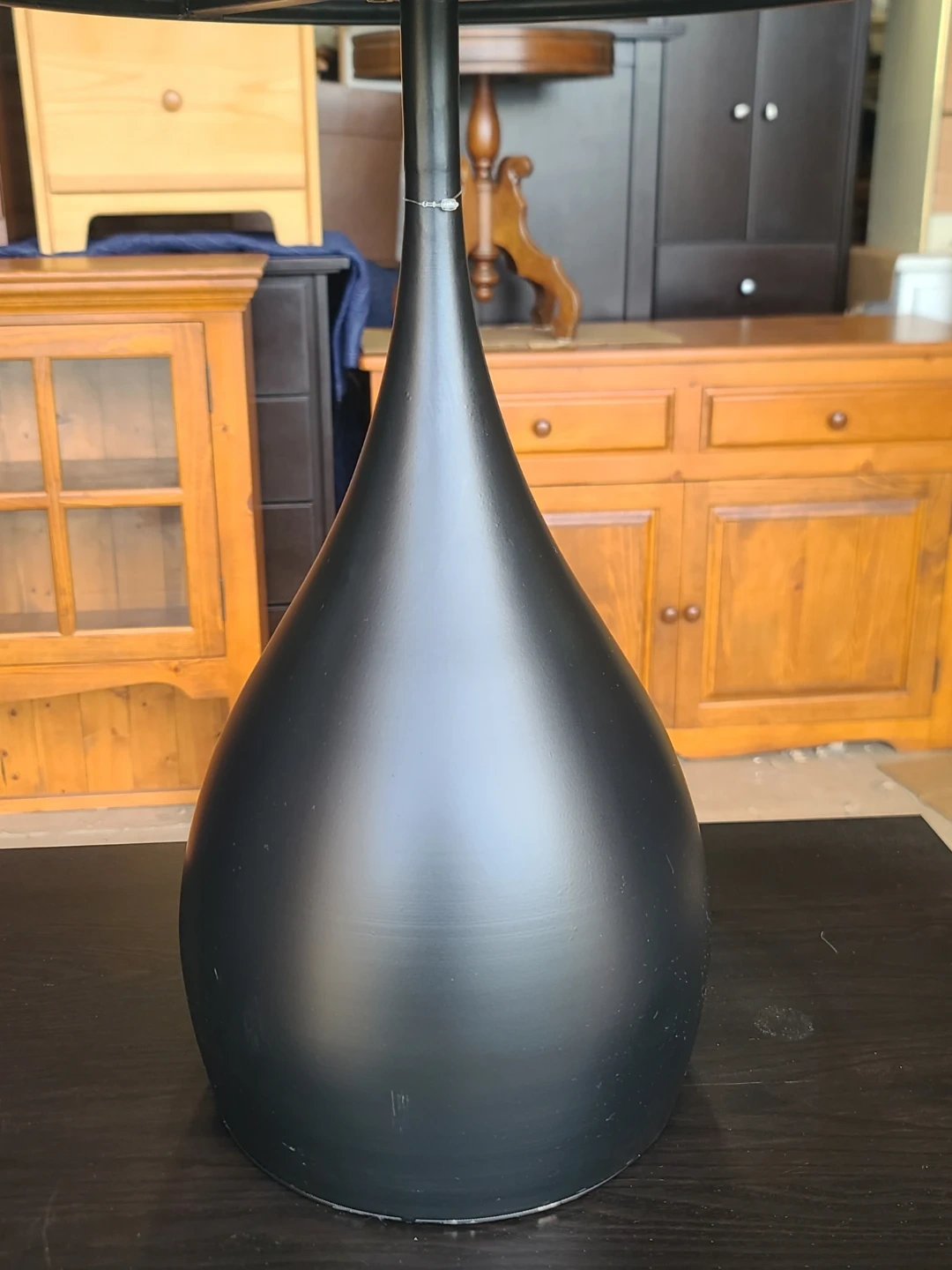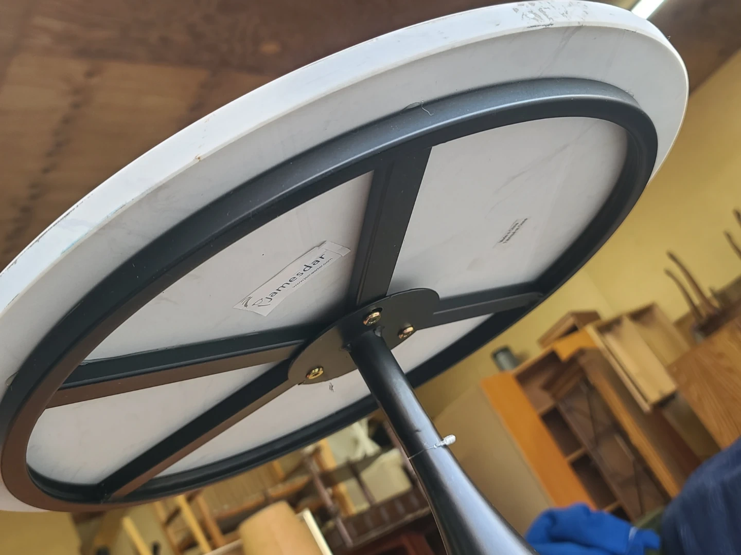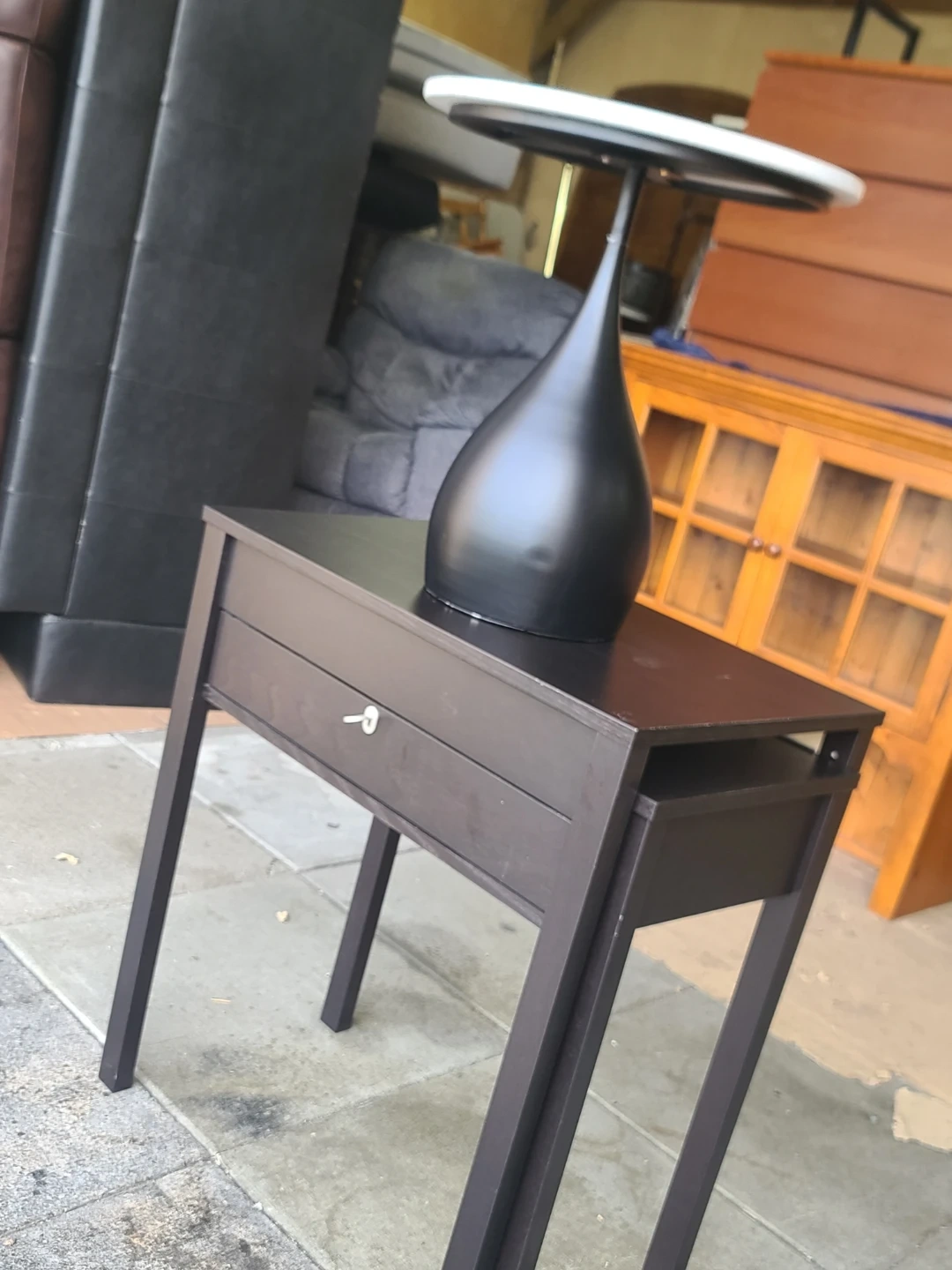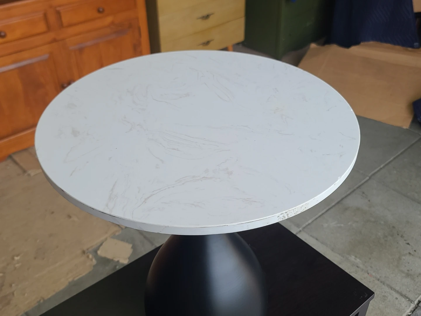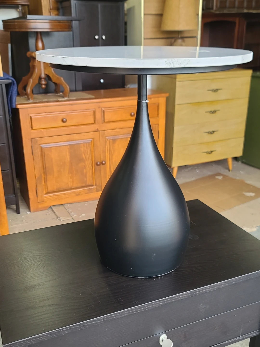 Stylish Jamesdar accent table. Has a cool white faux marble top with a sleek black metal base. Unique tear-drop shape. Great for a living room or bedroom. Measurements: Width 17 1/2" x 20" high. Viewing and pickup by appointment.
