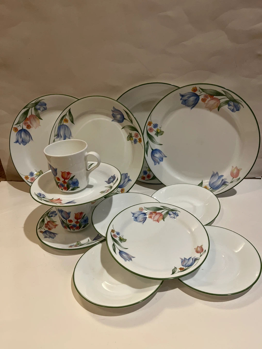 White plates and cups with a floral pattern featuring tulips and small blue flowers. Green trim on the edges. Includes multiple plates and at least two cups with saucers. Ceramic material.