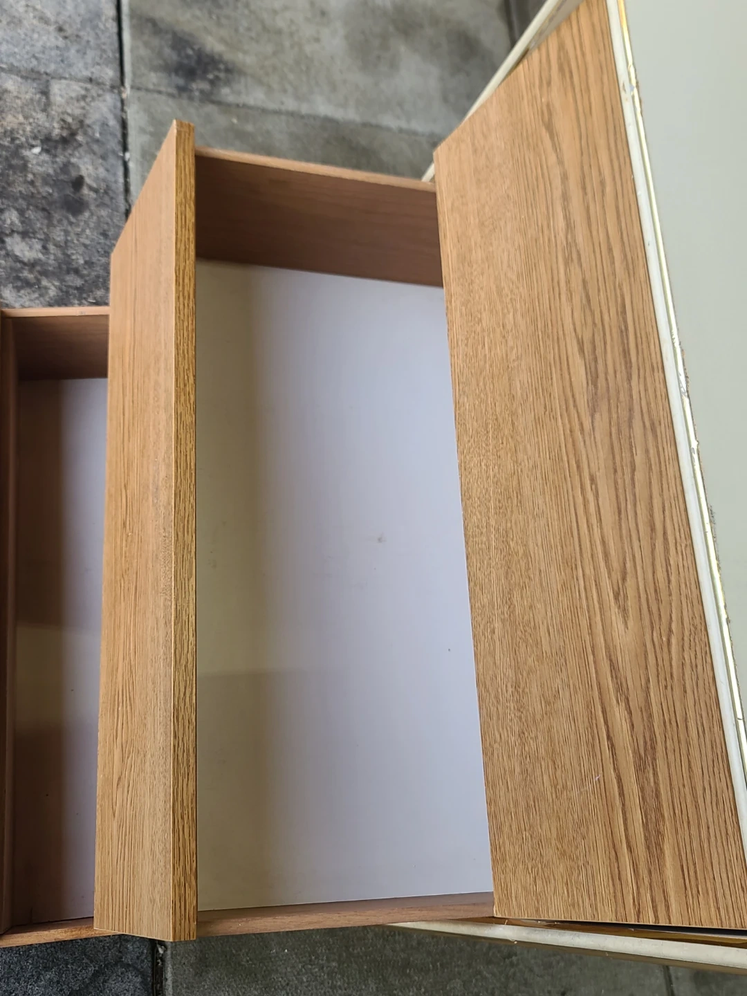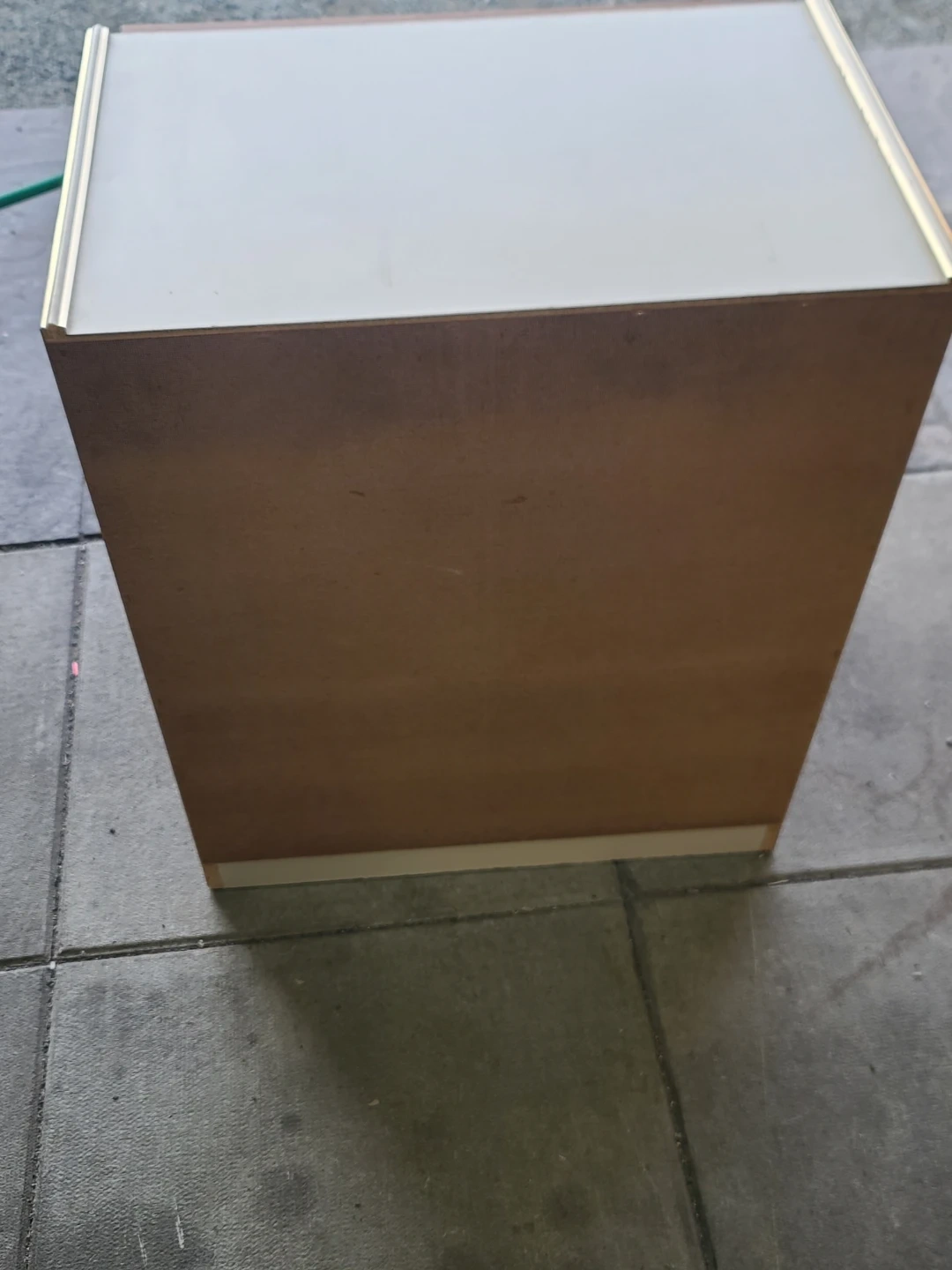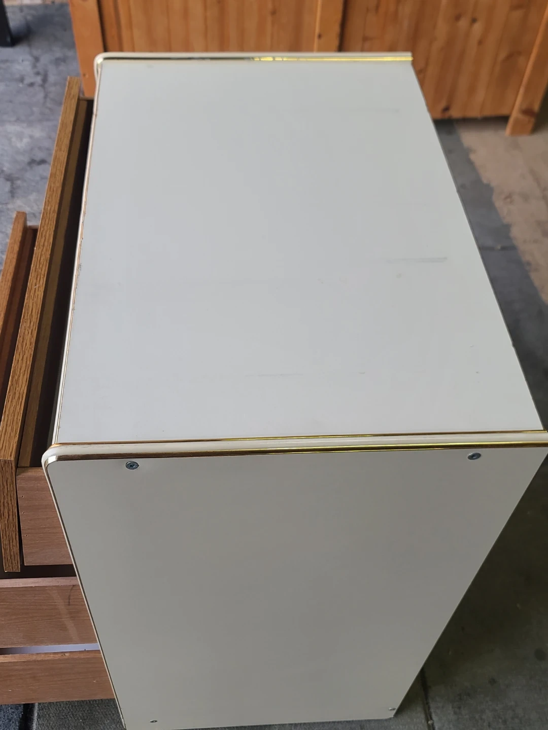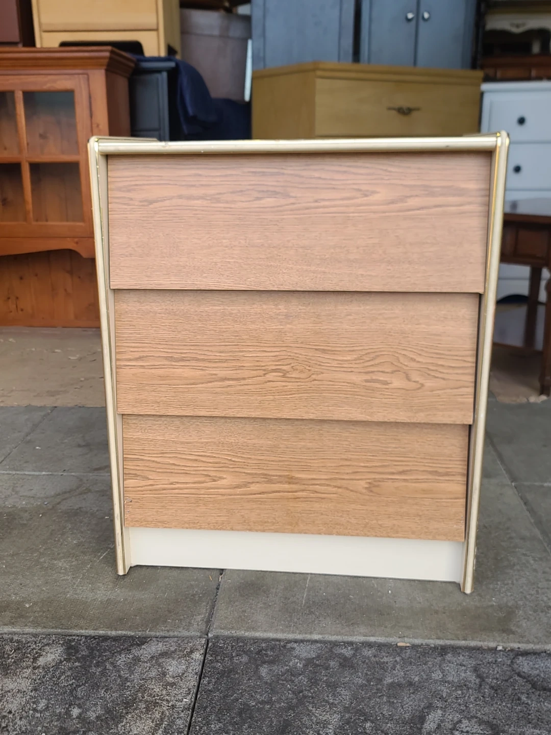 Functional little dresser or nightstand. Has 3 drawers with a cool wood-grain front. Light beige frame and gold trim on the edges. Good for extra storage in a bedroom or living room. Measurements: W 24 1/2" X D 16" X 29" high. Delivery can be arranged. Viewing and pickup by appointment.