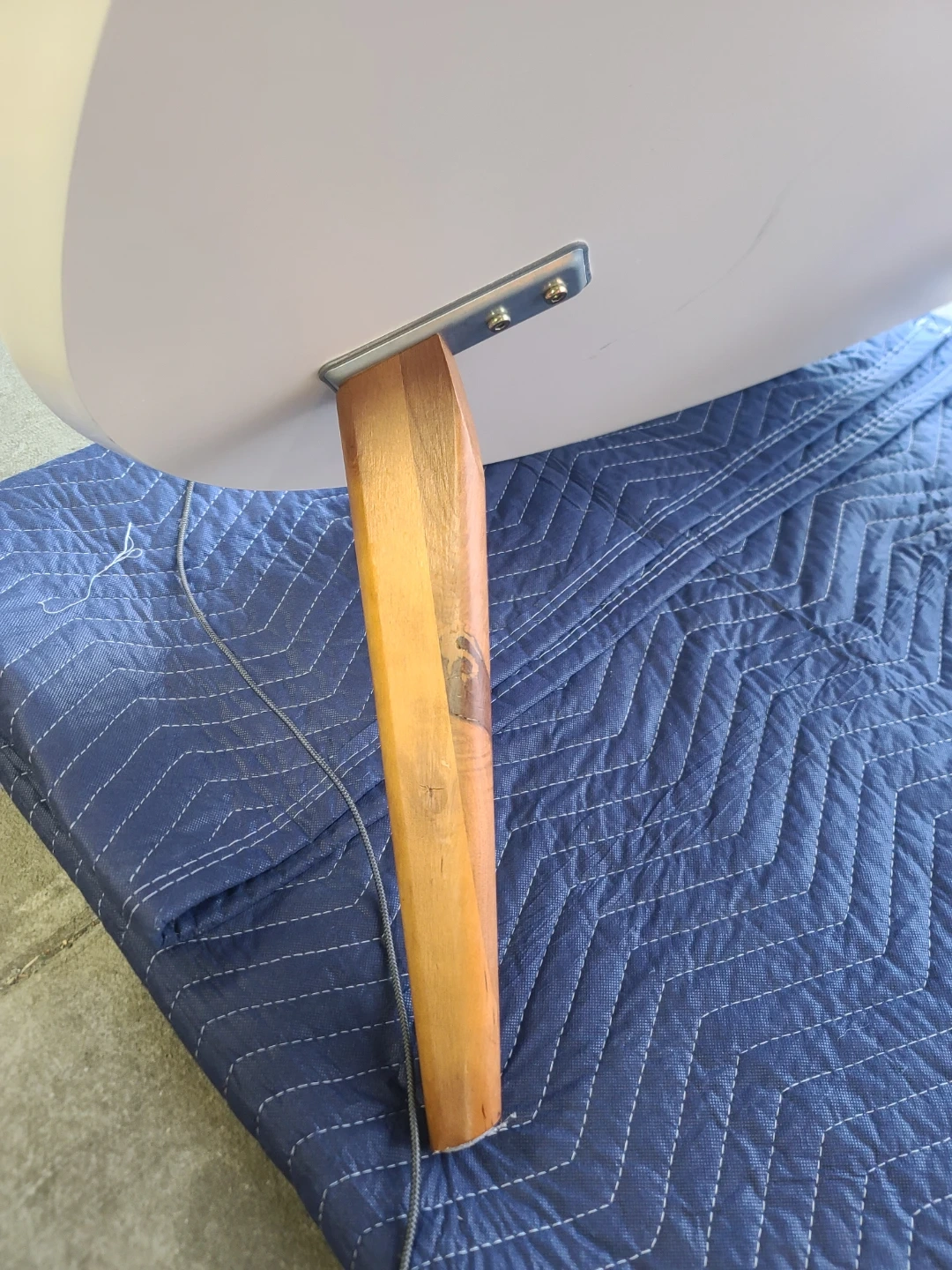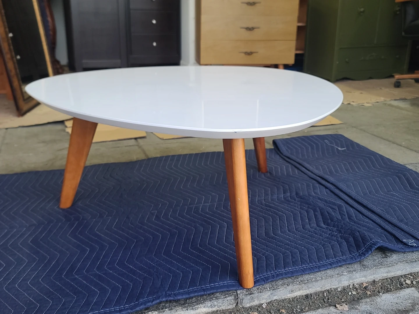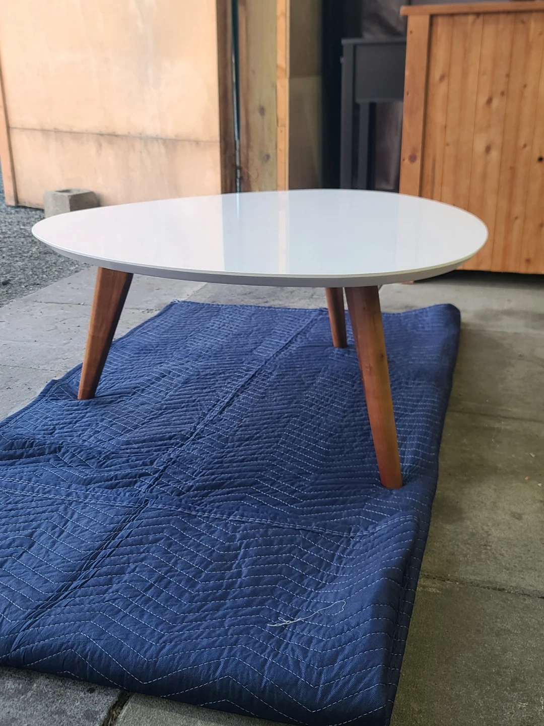 Stylish coffee table. Has a white oval top with three wooden tapered legs. Gives off a mid-century modern vibe. Great for living room or lounge area. Easy to clean surface. Delivery can be arranged. Viewing and pickup by appointment.