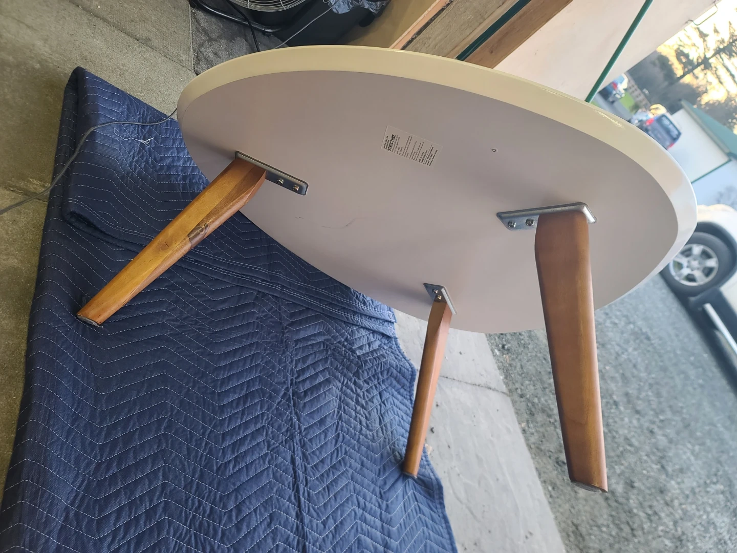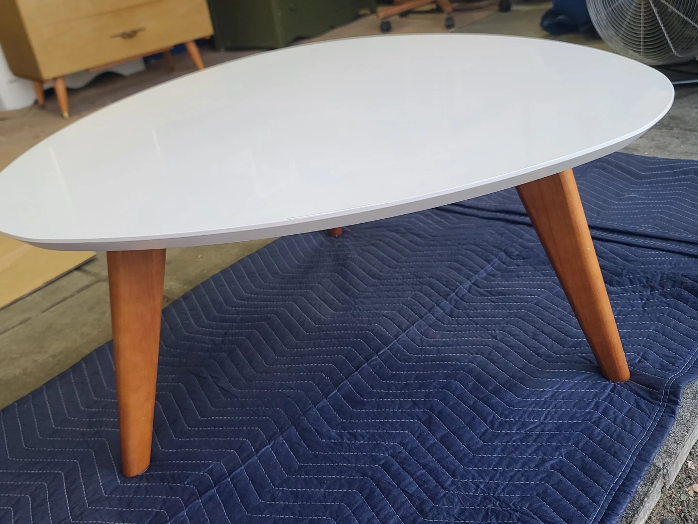 Stylish coffee table. Has a white oval top with three wooden tapered legs. Gives off a mid-century modern vibe. Great for living room or lounge area. Easy to clean surface. Delivery can be arranged. Viewing and pickup by appointment.