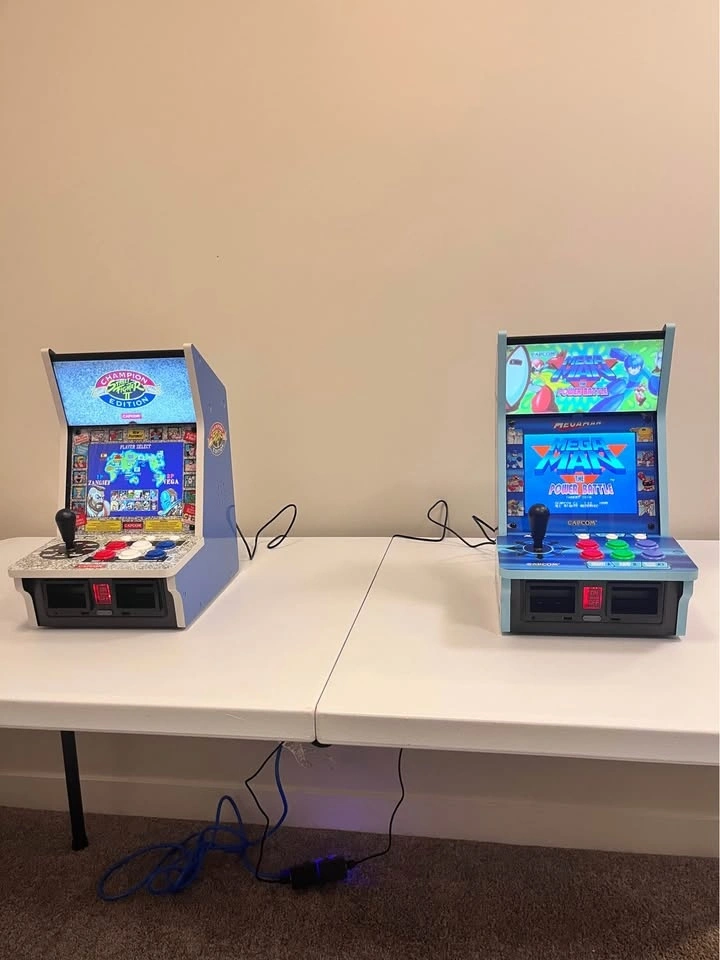 Turn your event into a retro arcade! This package features two Evercade Alpha Bartop Arcades (Mega Man & Street Fighter editions) plus everything you need for instant fun — perfect for company events, birthday parties, or trade show booths in Edmonton.