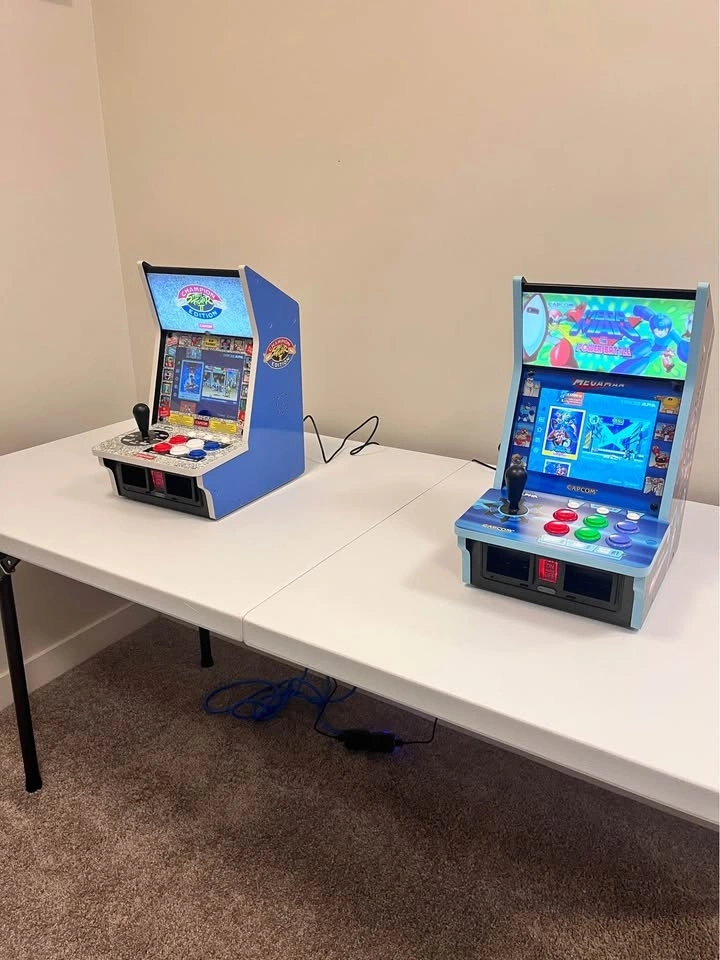 Turn your event into a retro arcade! This package features two Evercade Alpha Bartop Arcades (Mega Man & Street Fighter editions) plus everything you need for instant fun — perfect for company events, birthday parties, or trade show booths in Edmonton.