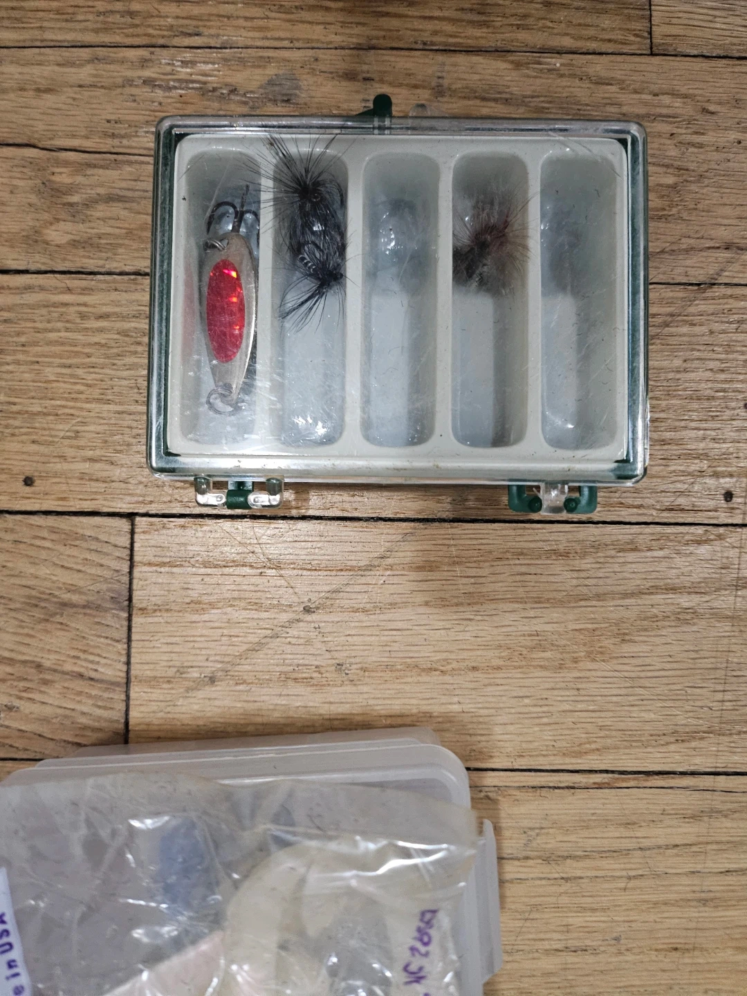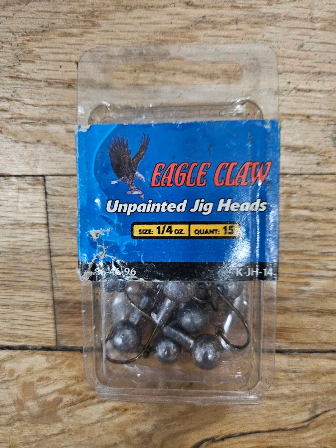 Includes a variety of fishing lures and unpainted jig heads. Specific brands visible include 'Mann's' and 'Eagle Claw'. Jig heads are 1/4 oz and there are 15 in the pack. A great selection for any angler!