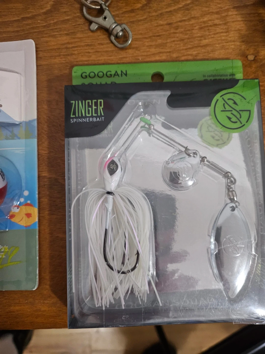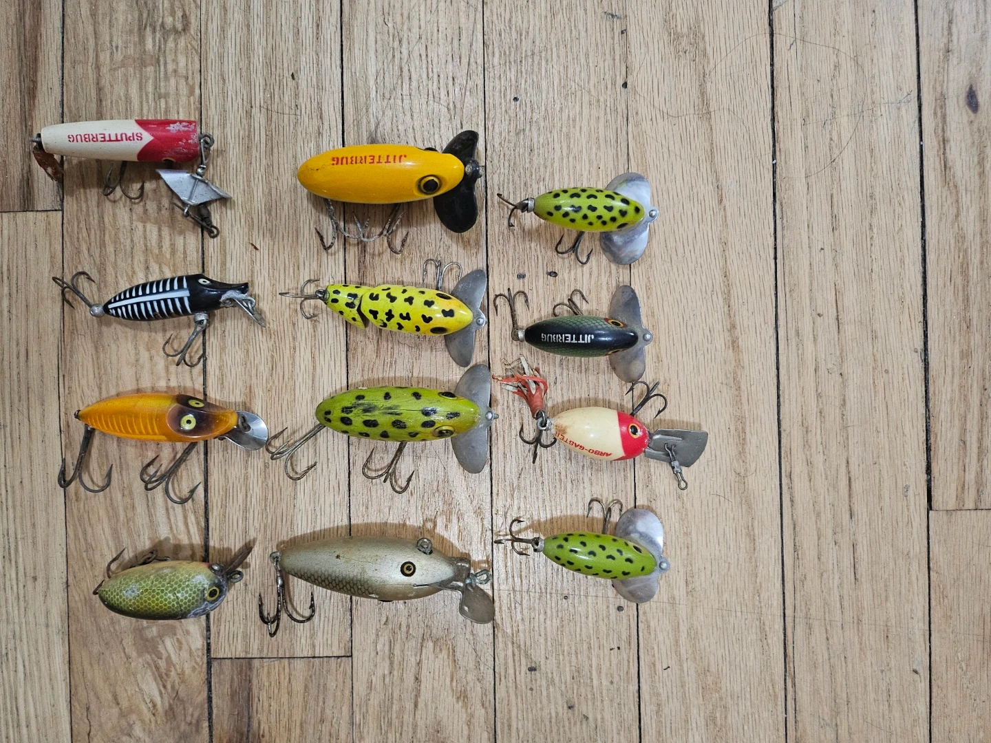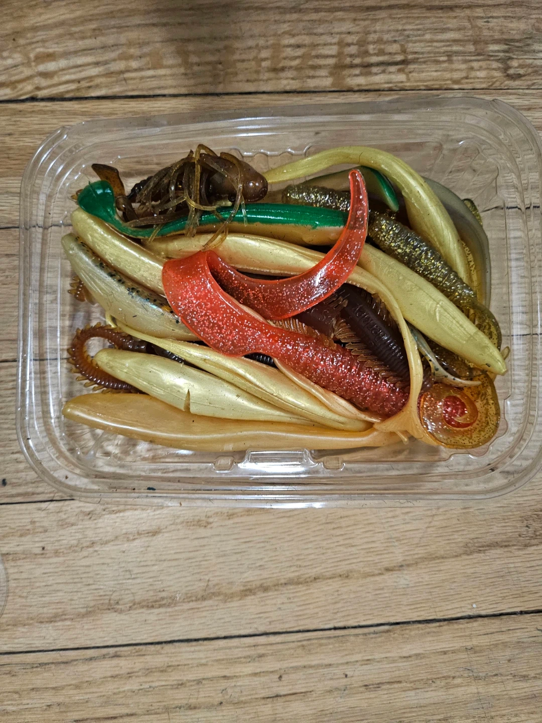 Includes a variety of fishing lures and unpainted jig heads. Specific brands visible include 'Mann's' and 'Eagle Claw'. Jig heads are 1/4 oz and there are 15 in the pack. A great selection for any angler!