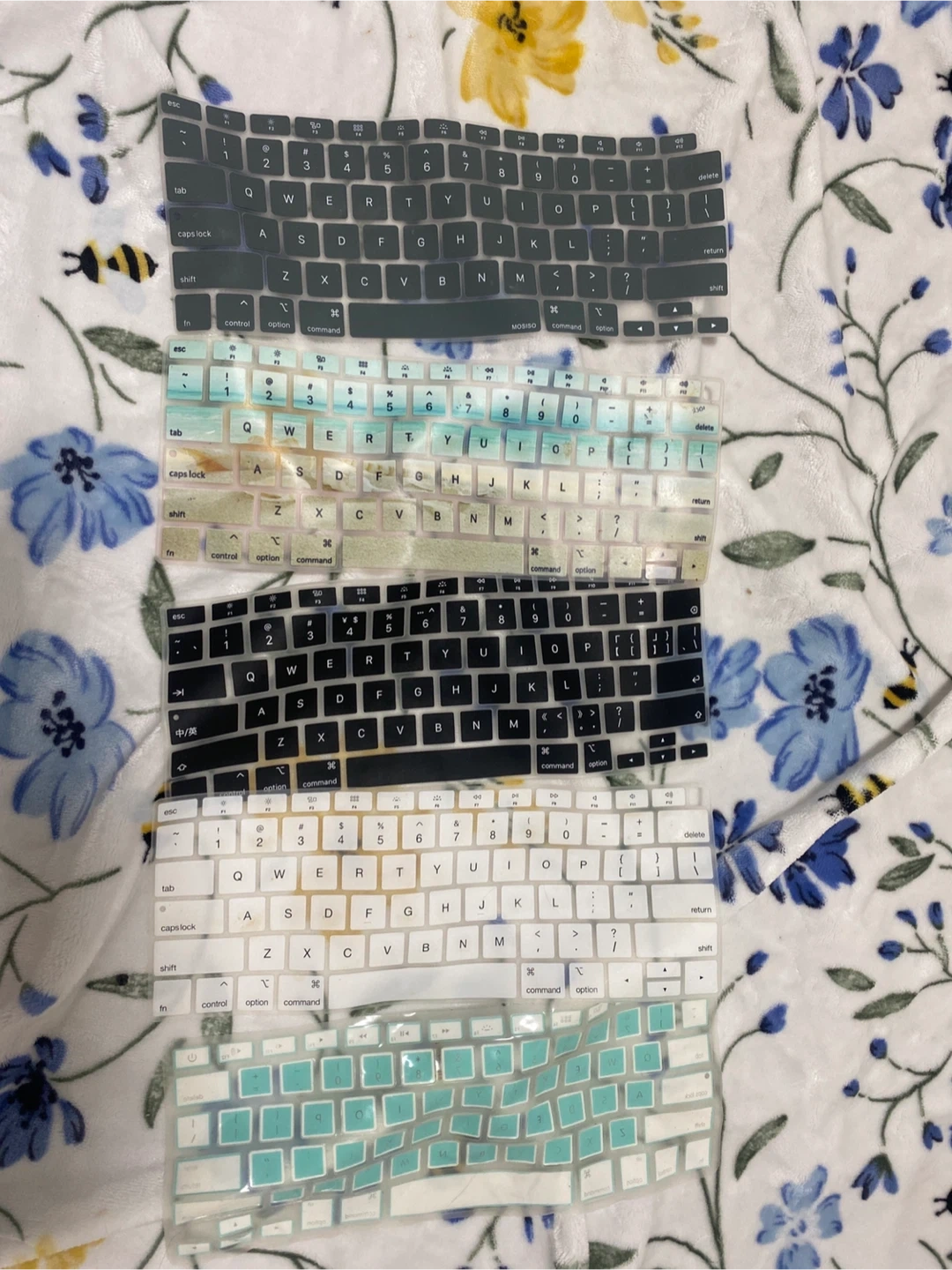 This lot includes multiple keyboard covers designed for MacBooks. They come in various colours including black, white, light blue, and a gradient pastel effect. These are protective silicone covers for your laptop keyboard. Pick up cash only 7 each