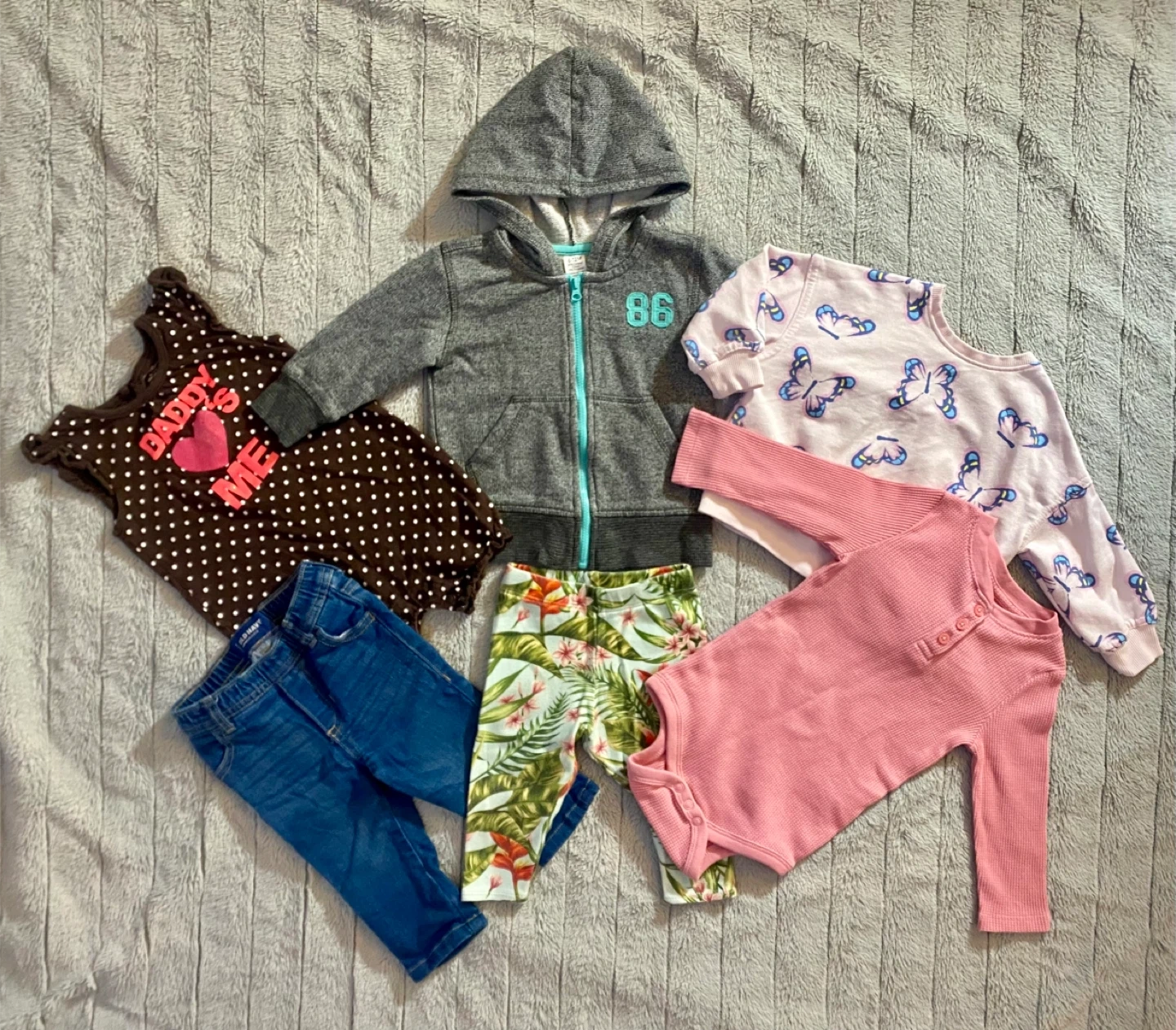 6-12 month girls clothing lot includes a zip up grey hoodie, a long sleeve butterfly sweater, a long sleeve pink onesie with buttons, a brown polka dot jumper with “daddy hearts me” on front, tropical leggings, and blue denim jeans. From Old Navy, Ollie Jones, Joe fresh, and George brands.