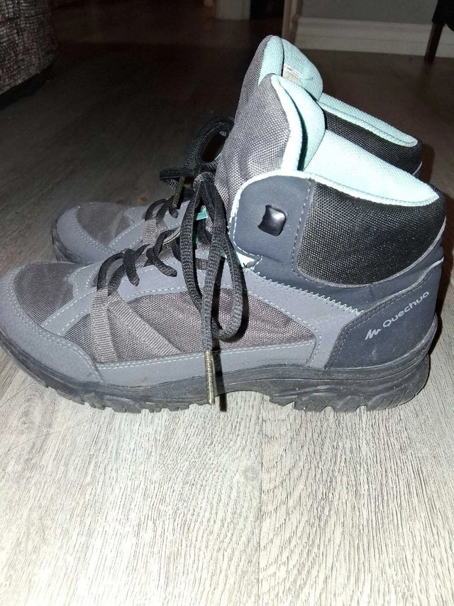 Step into adventure with these Quechua hiking boots, size 38! These boots have been my trusty companions on many trails, and while they show signs of wear, they're ready for many more adventures. The sturdy construction and comfortable fit make them ideal for hiking. They have provided great ankle support on tough trails, and I am sure they will be a good companion for you too. Brand: Quechua, Size: 38. Looking at similar boots on Kijiji, a fair price for these well-loved hiking boots is $35. If the ad's still up, the boots are available! Cash accepted.