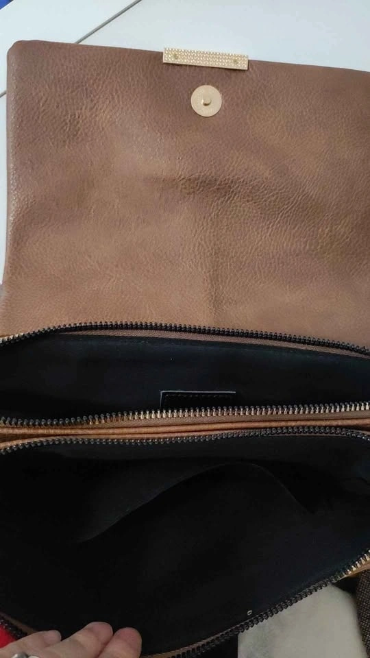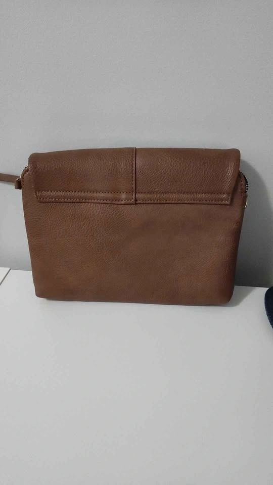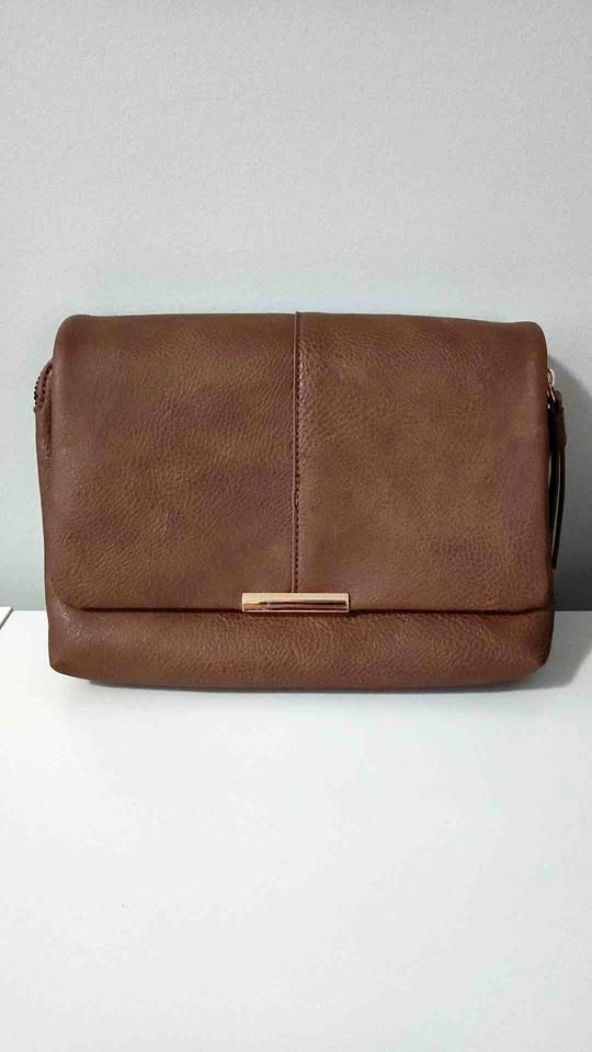 Snap flap closure with 2 zippered compartments. Adjustable strap is lost. Exterior: 100% polyurethane. Lining: 100% recycled polyester. Height: 7 in, Length: 9 in, Width: 2 in.