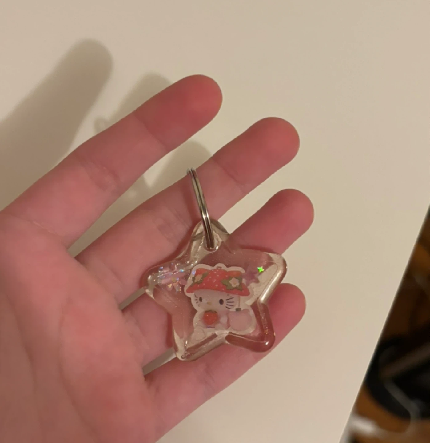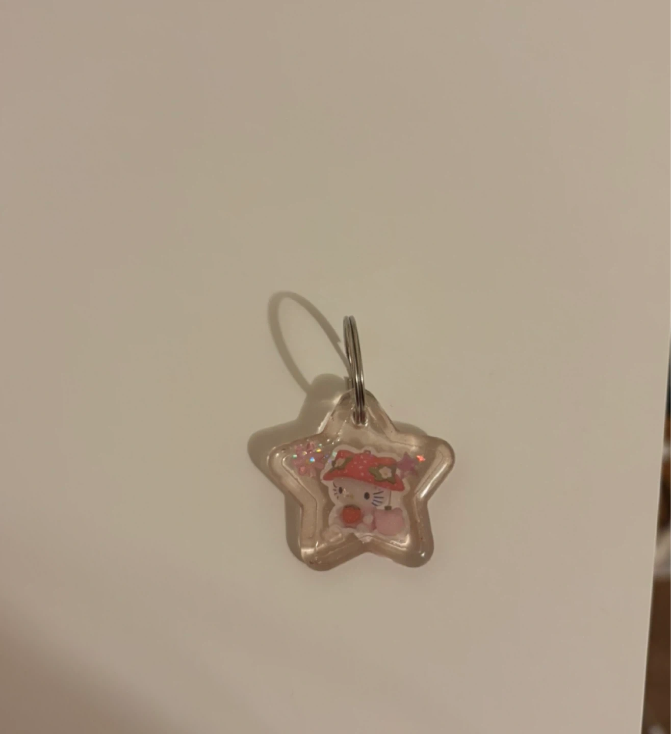 Cute star-shaped keychain featuring Hello Kitty in a mushroom hat. It's filled with glitter. Perfect for personalizing backpacks or keys!