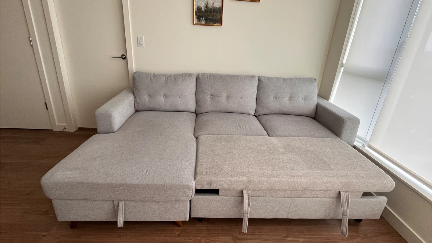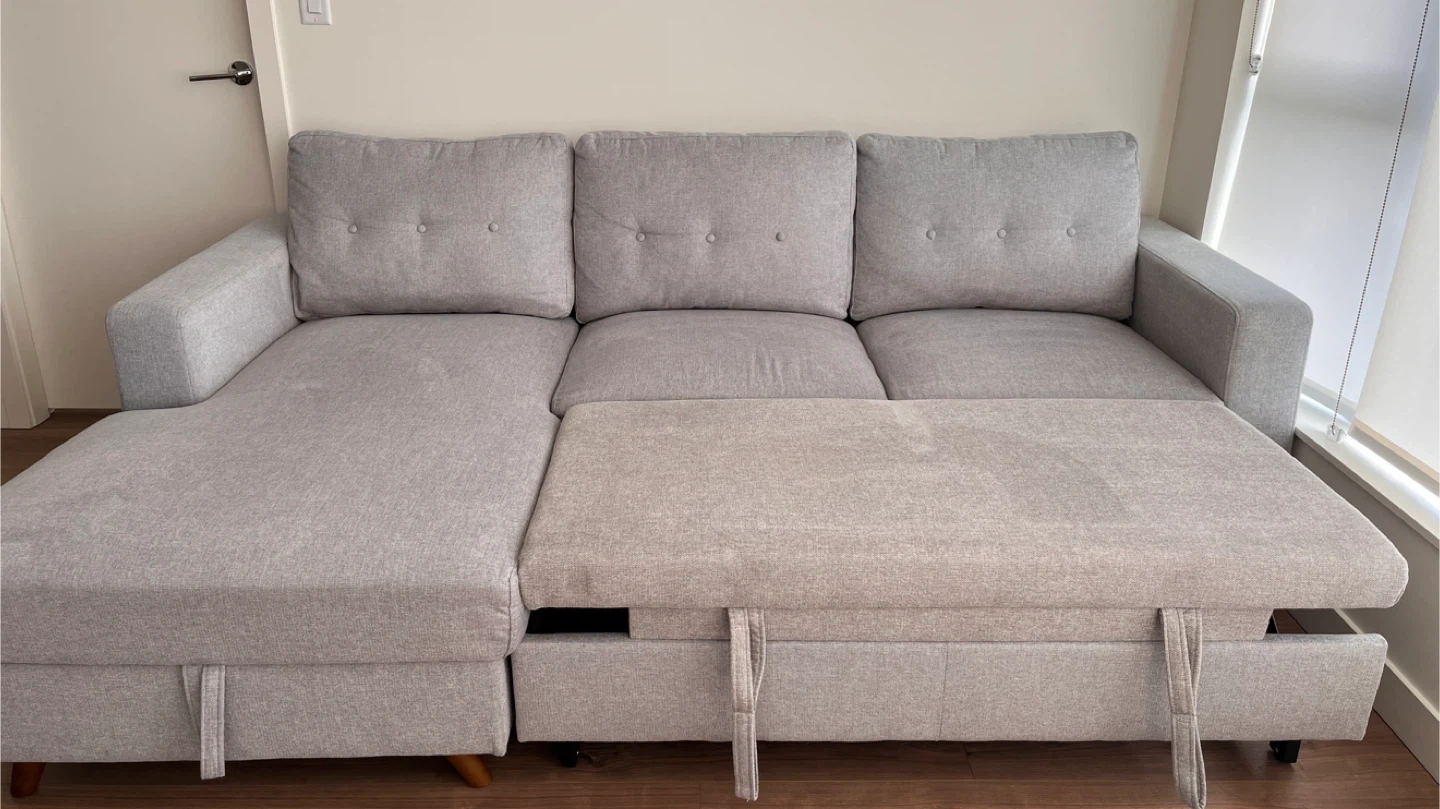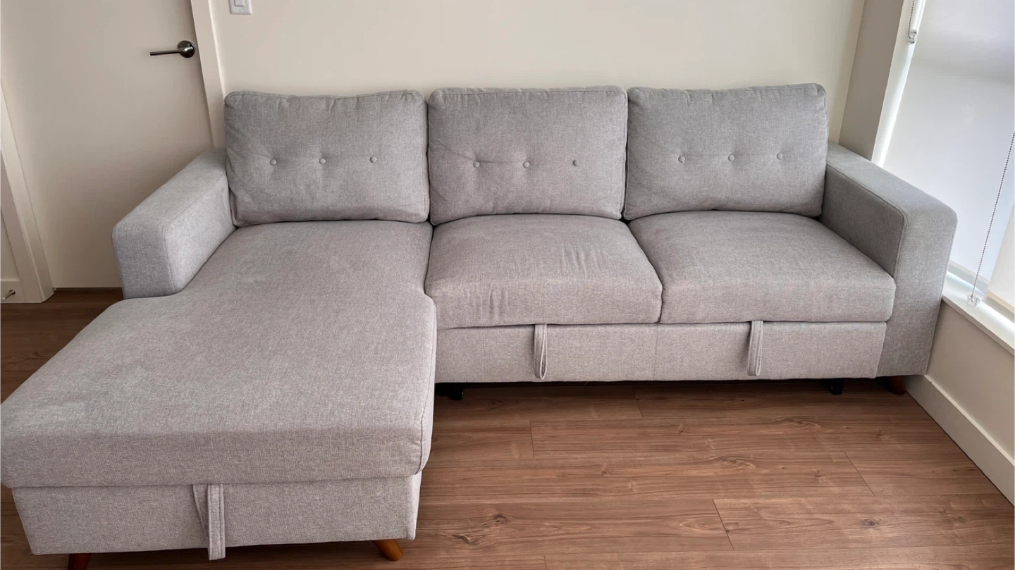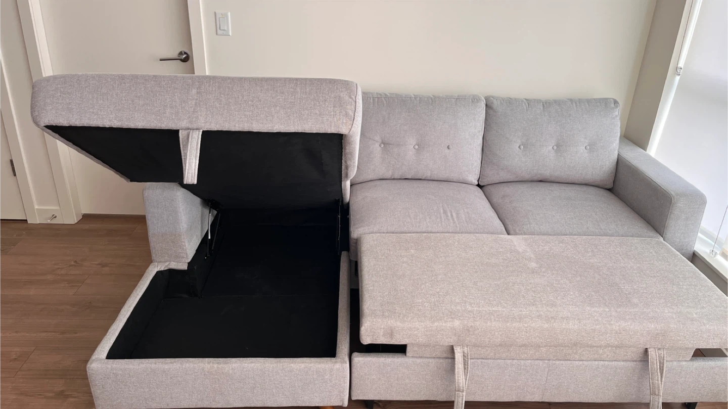 Comfortable grey sectional sofa, perfect for lounging or guests. It features a pull-out bed mechanism and built-in storage underneath the chaise.