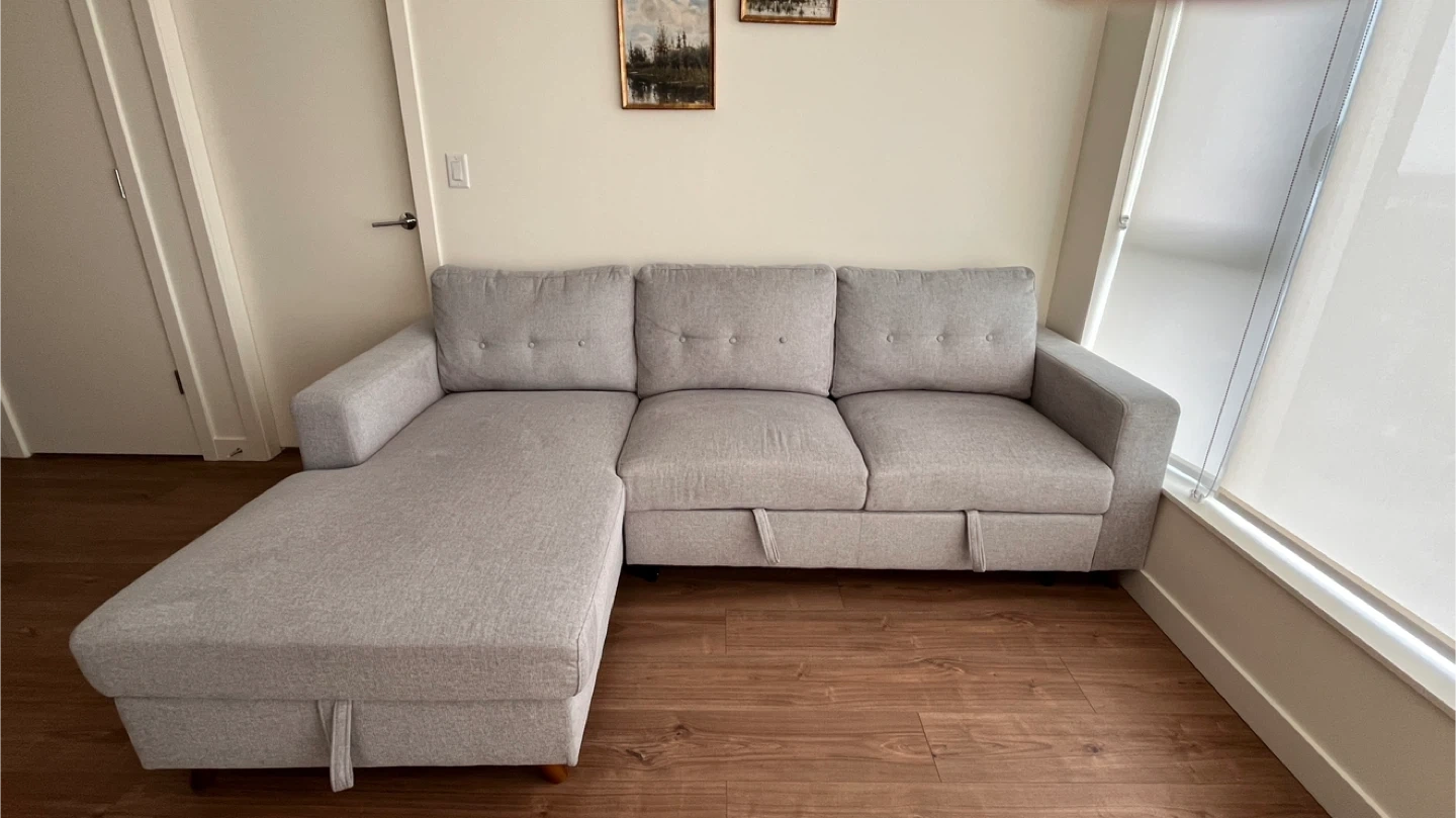 Comfortable grey sectional sofa, perfect for lounging or guests. It features a pull-out bed mechanism and built-in storage underneath the chaise.