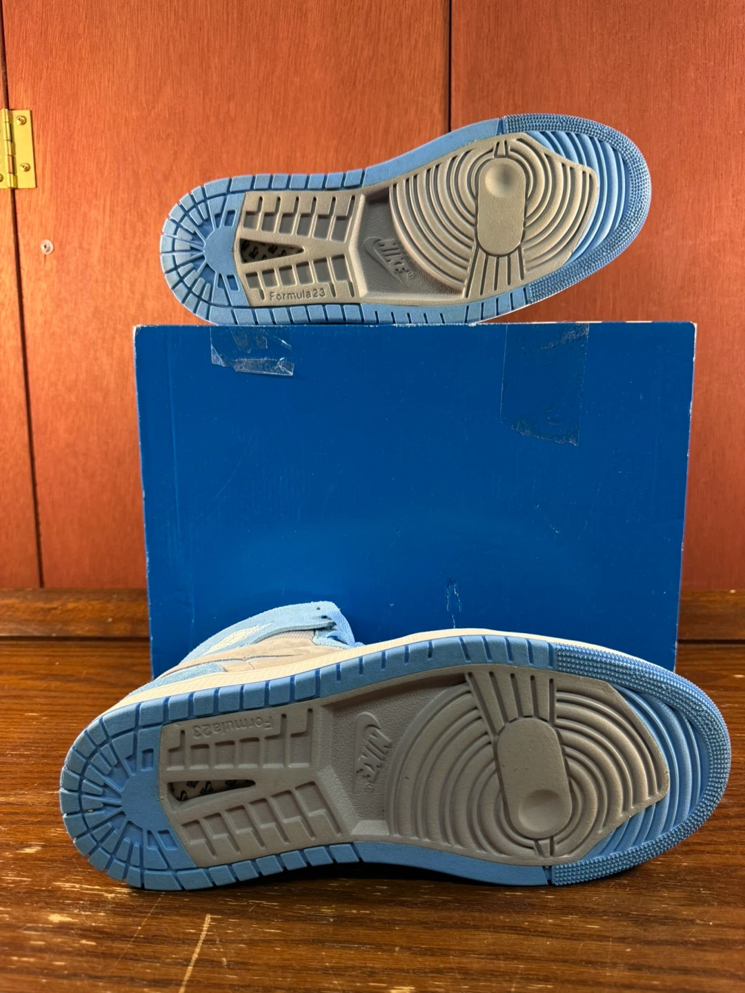 These high-top Nike Air Jordan 1s feature a blue and grey suede construction. They include the "Zoom Air" technology and "Formula 23" outsole.