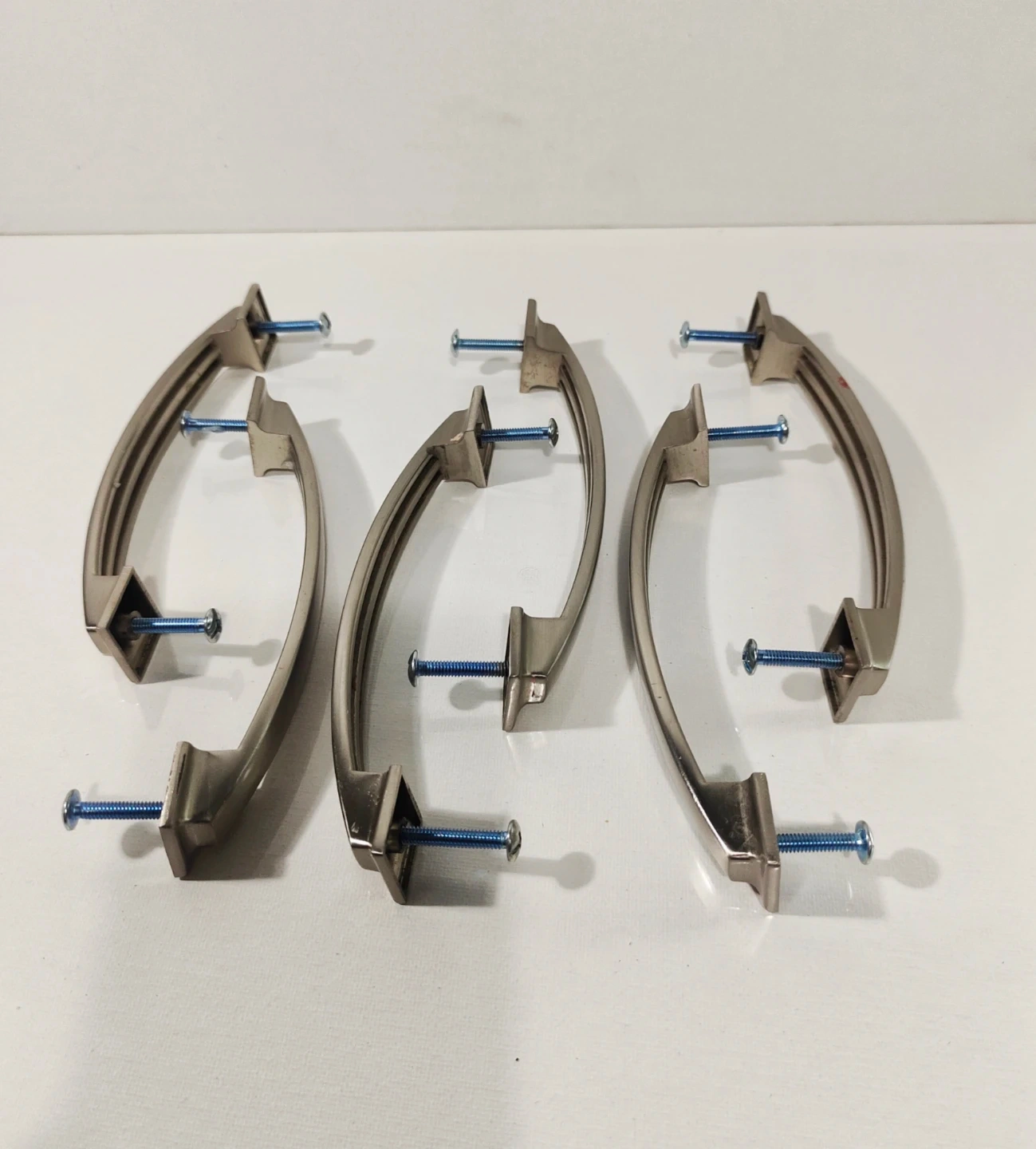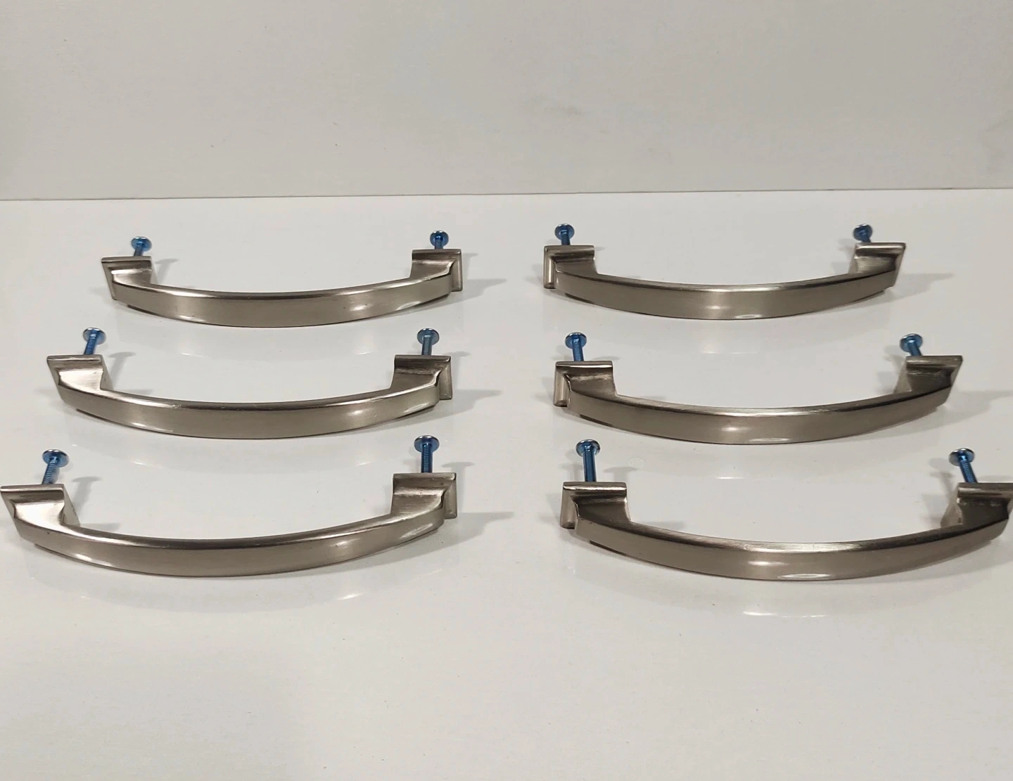 Six cabinet or drawer pulls with a brushed nickel finish. They come with screws for installation. These are great for updating kitchen or bathroom cabinetry.